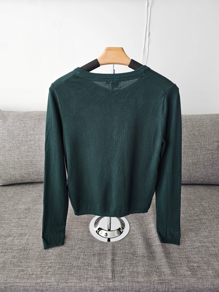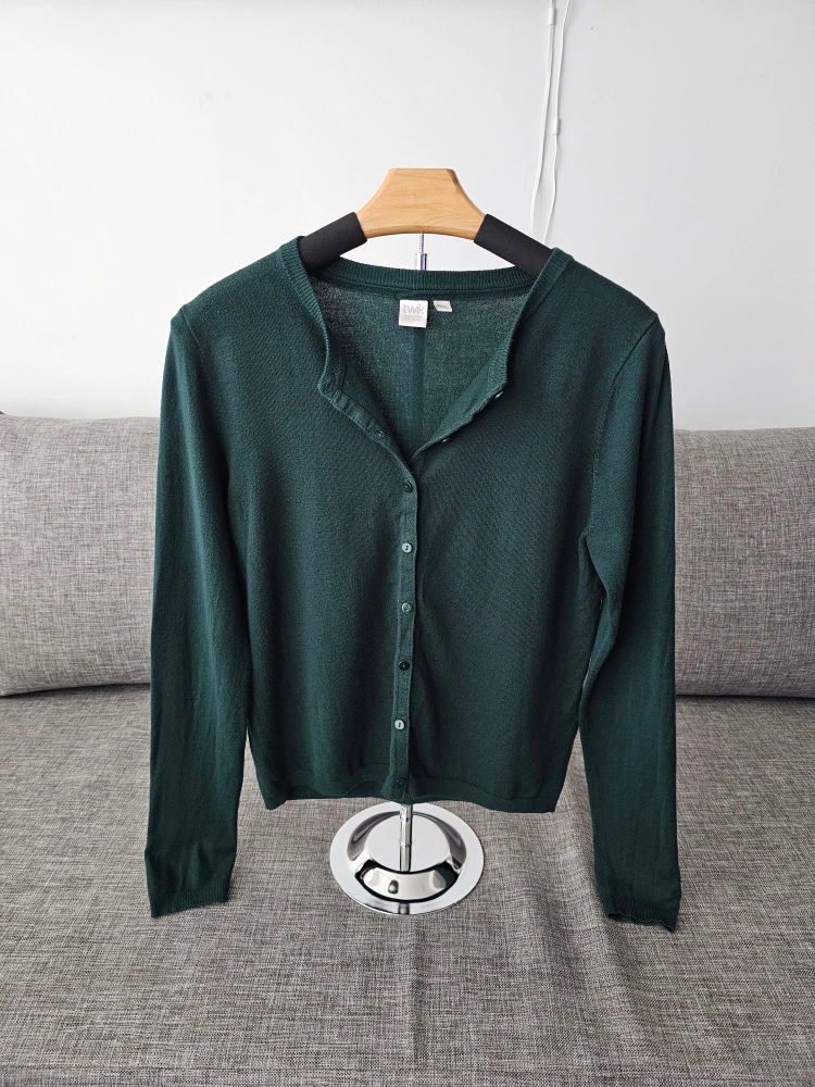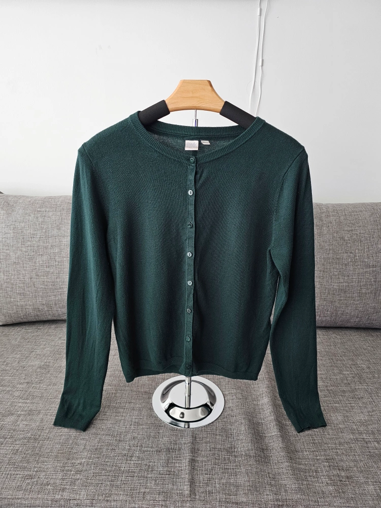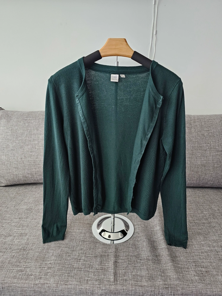 5Long sleeve, button up, dark green cardigan. Soft material. Relaxed fit.