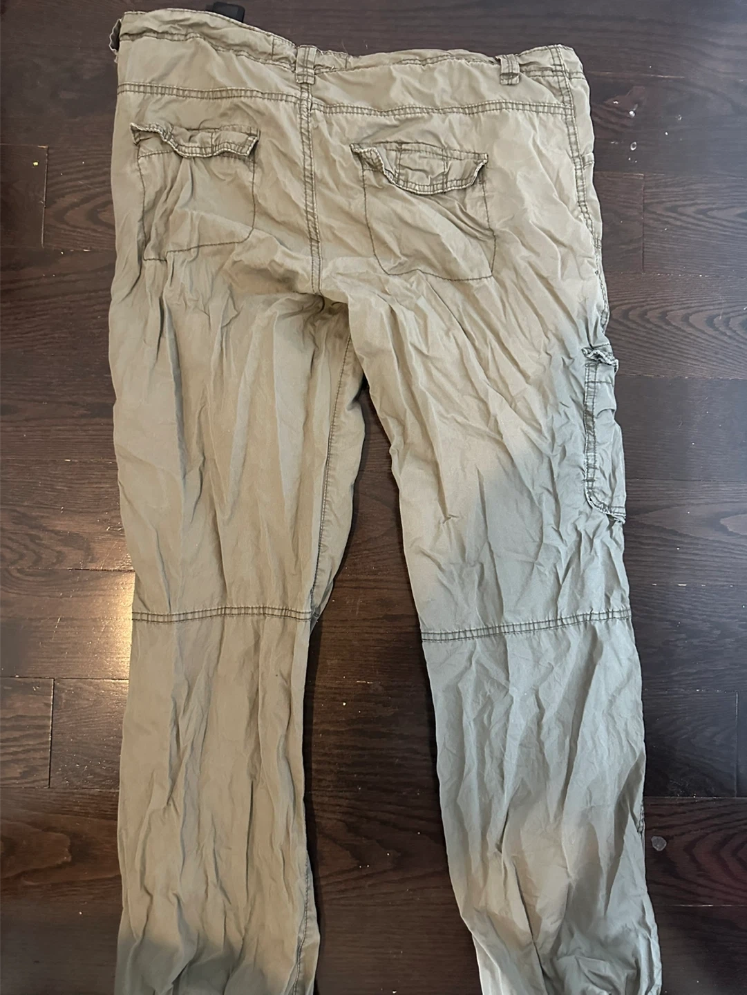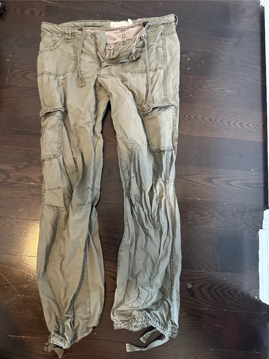 26Selling a pair of women's cargo pants in a green colour. They have a relaxed fit and lots of pockets, . There’s no major flaws Cash only Willing to negotiate price