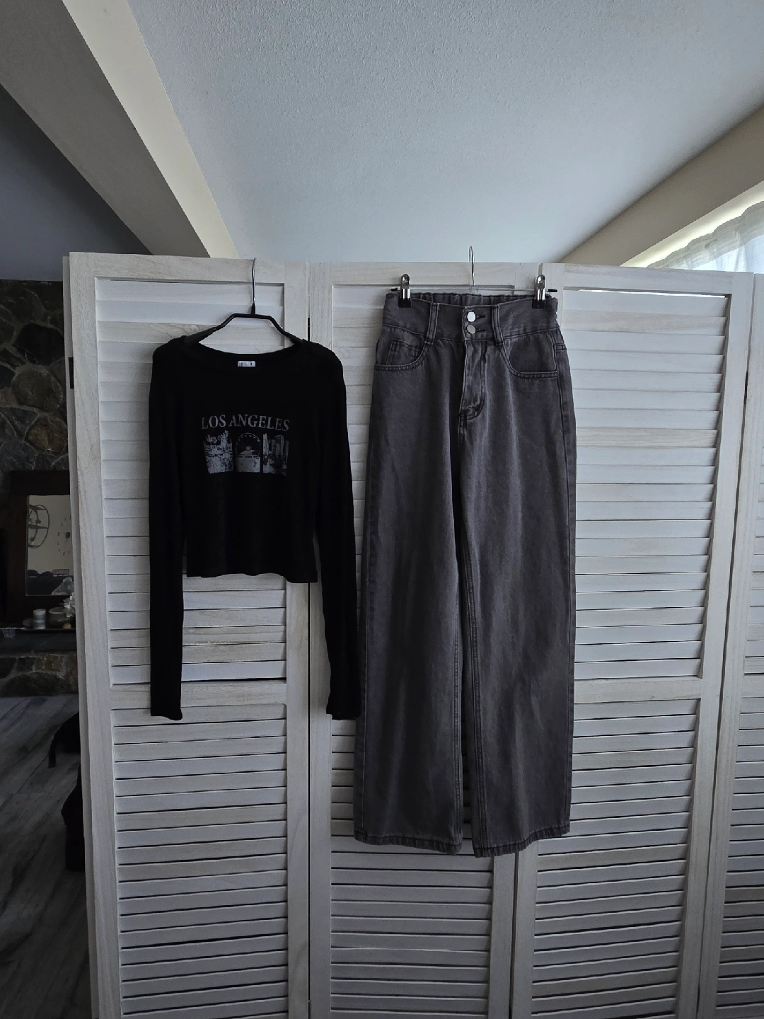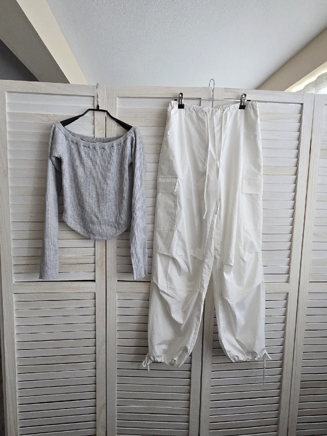 10Selling a women's long sleeve top and white cargo pants. The top is grey and the pants are white. Both items are in great condition!