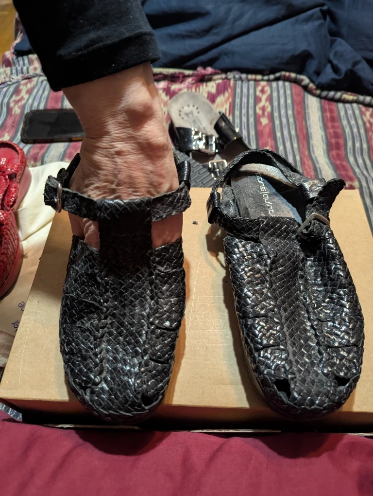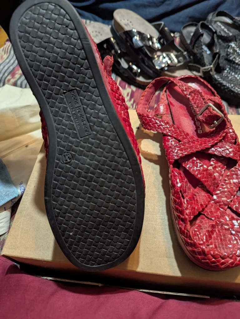 641Three pairs of Italian women's sandals in woven leather, in black and red. All in size 7. Each pair priced at $50.00, better price on all 3 pairs.