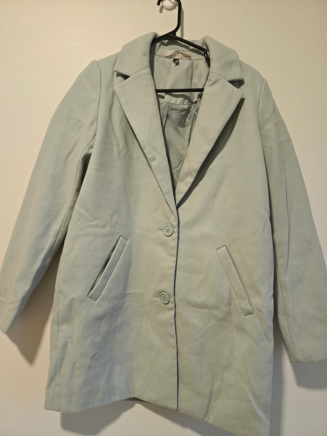 55Stylish light green peacoat. Three button closure. Long sleeves. Two front pockets. Excellent for spring or fall. pick up in Langley