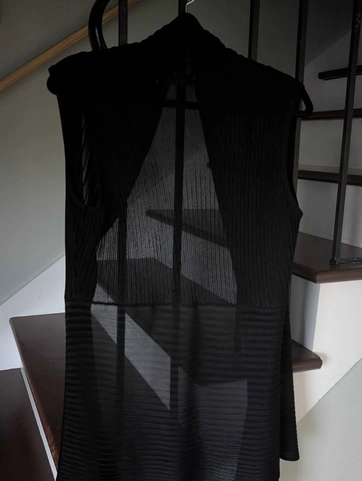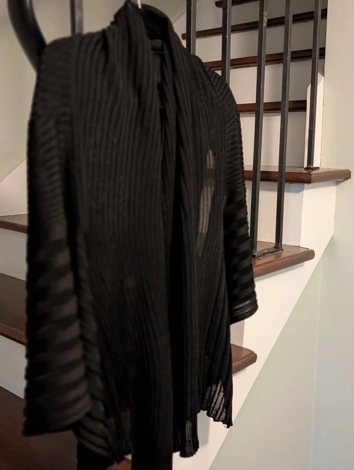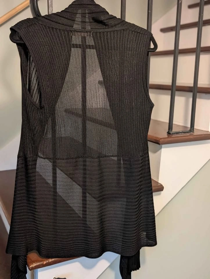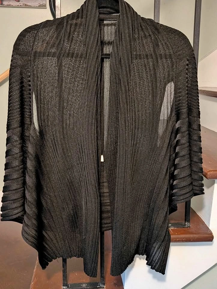 26Women's dual purpose shawl/ long vest. It can be worn either way. It is a versatile layering piece made of lightweight textured black fabric. North St Catharines pickup, cash only please