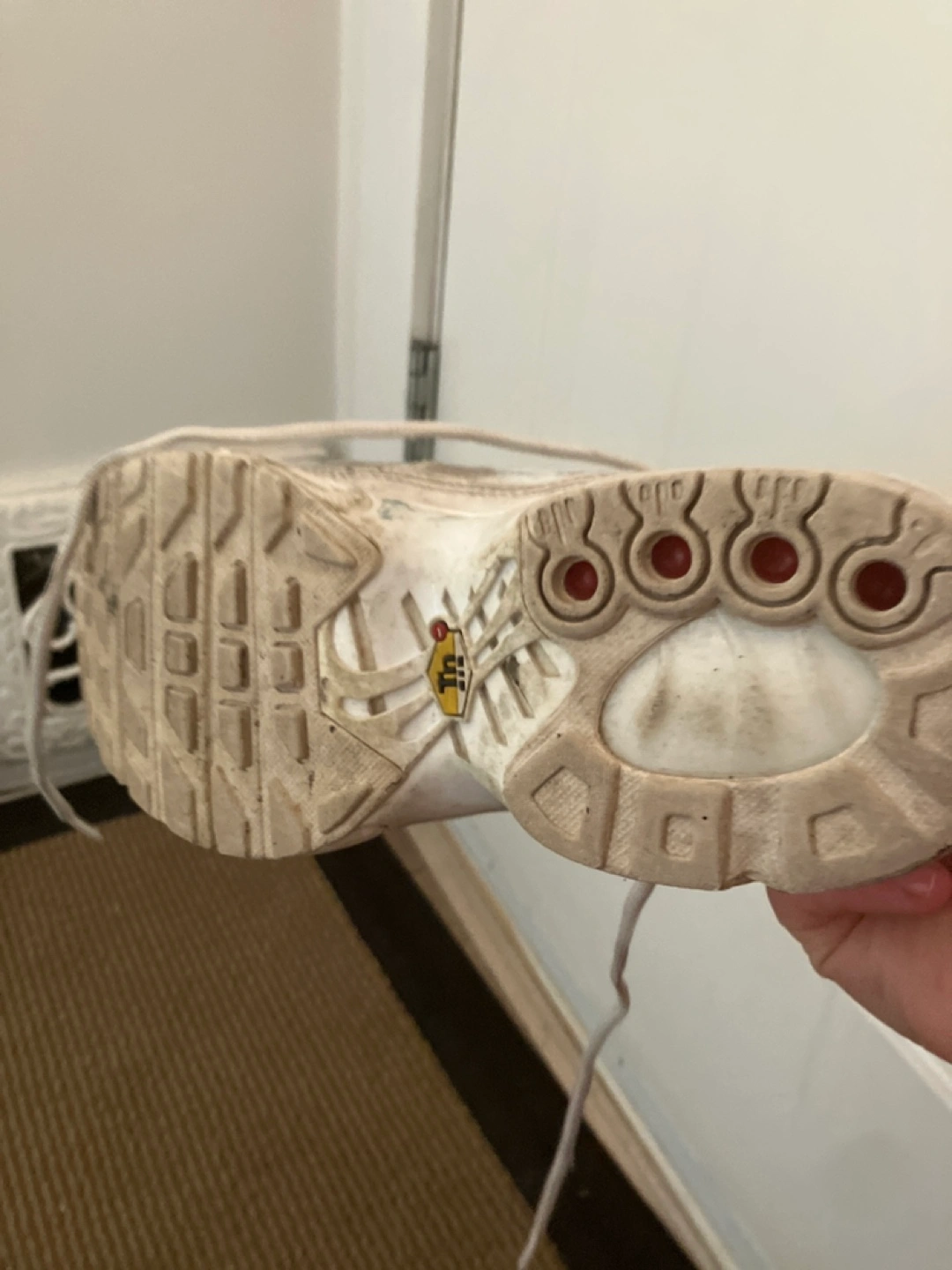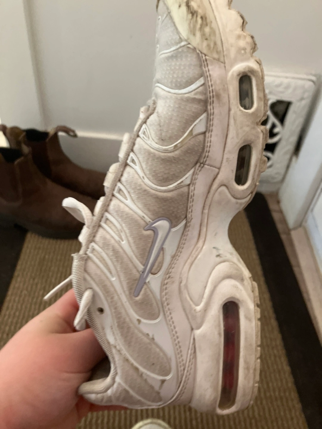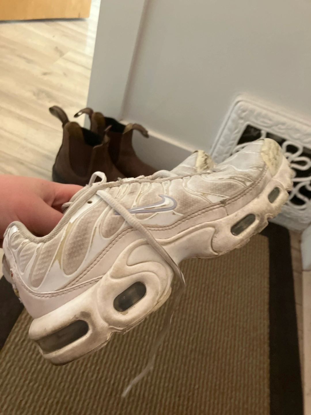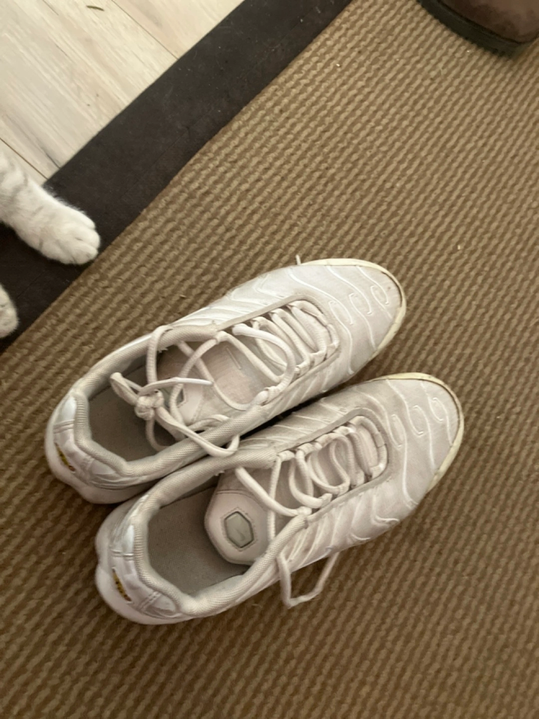 Pre-owned women's Nike Air Max Plus TN running shoes. White colour. Some wear and tear visible. Great for casual wear.