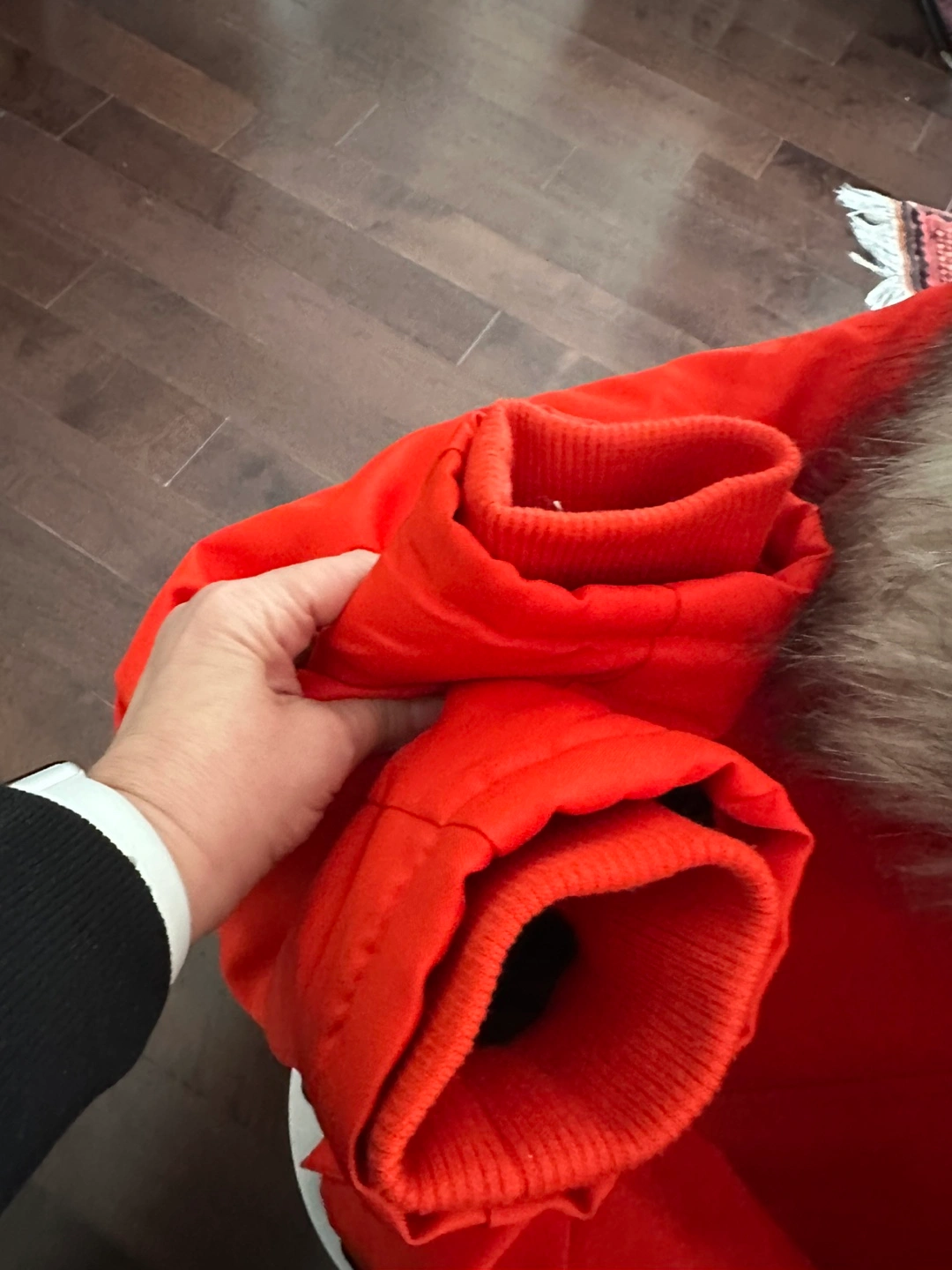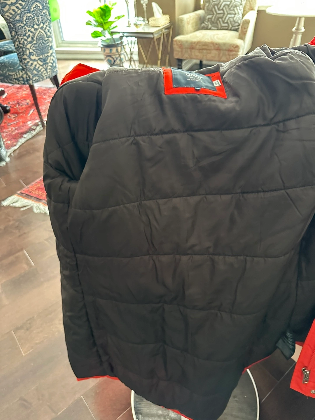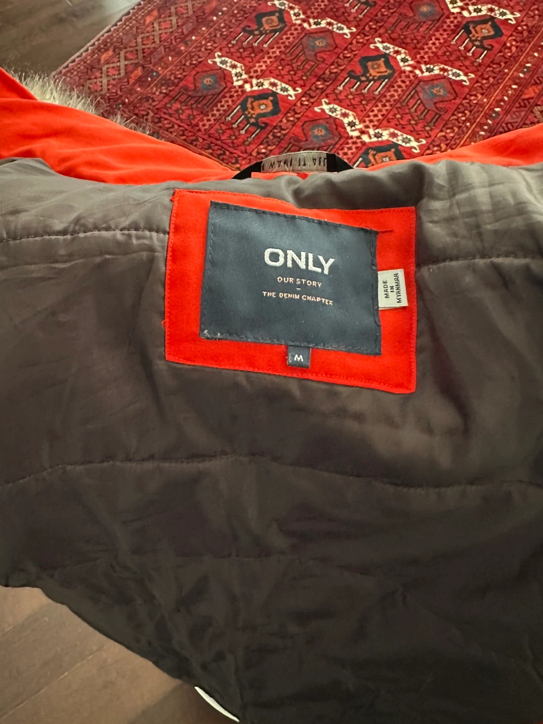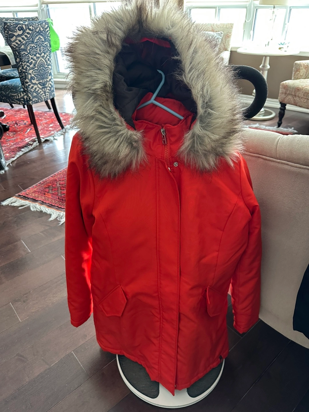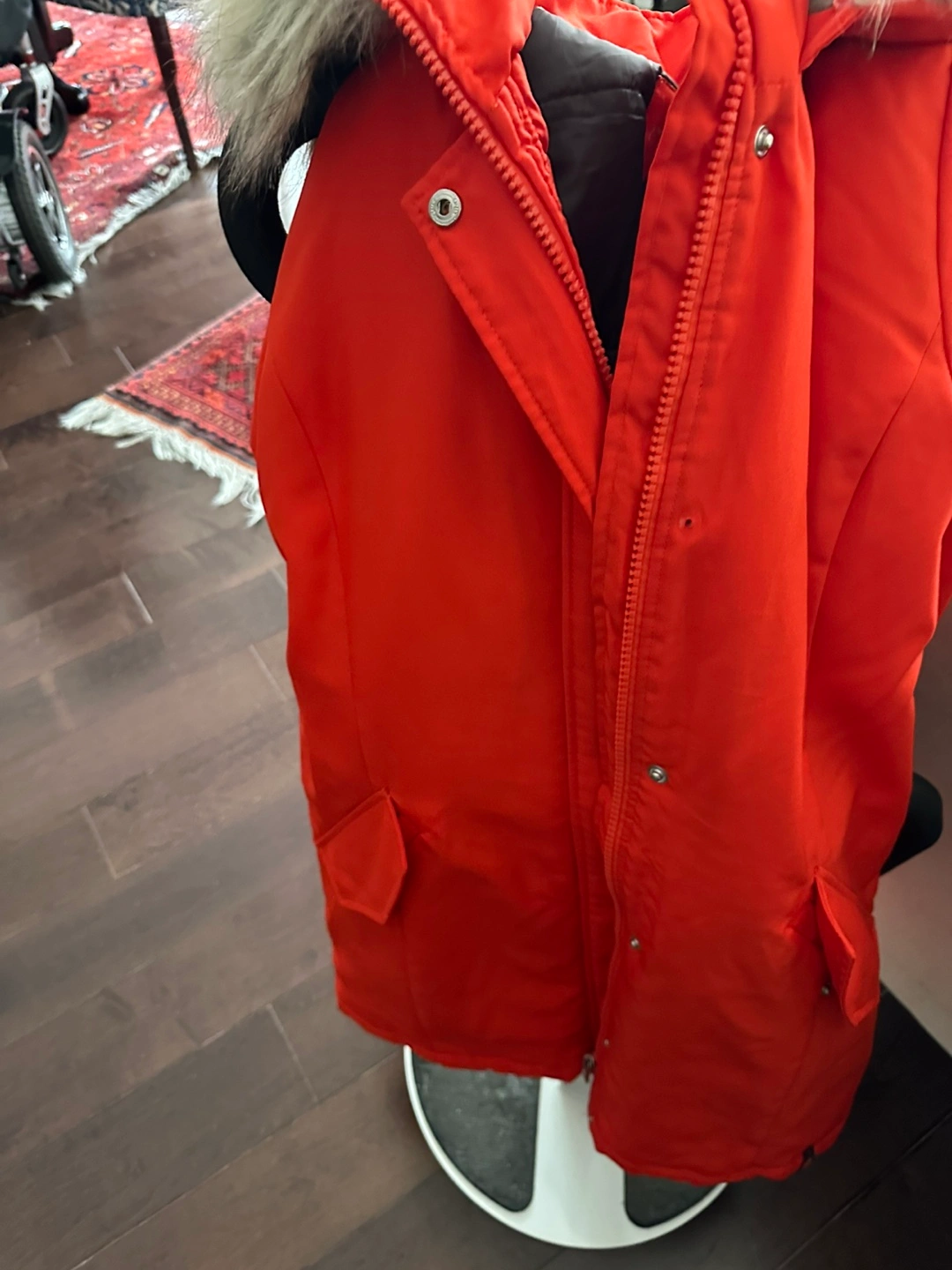 Warm winter parka. Bright orange colour. Features a faux fur-trimmed hood and zipper closure. Pockets included. Size medium.