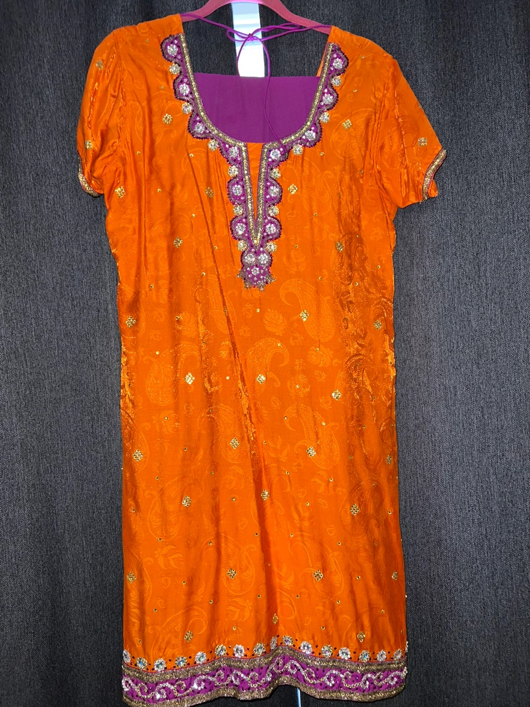 Selling a beautiful orange and purple salwar kameez. It features intricate detailing around the neckline and hem. Perfect for a special occasion!