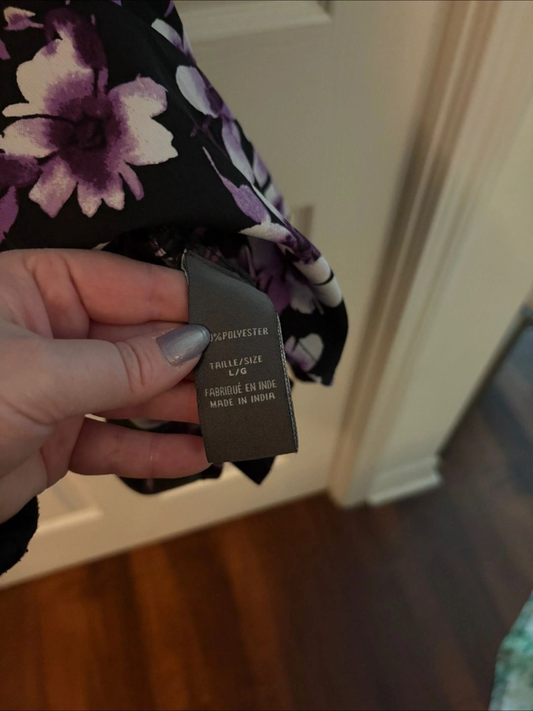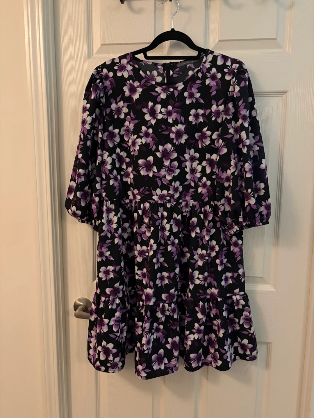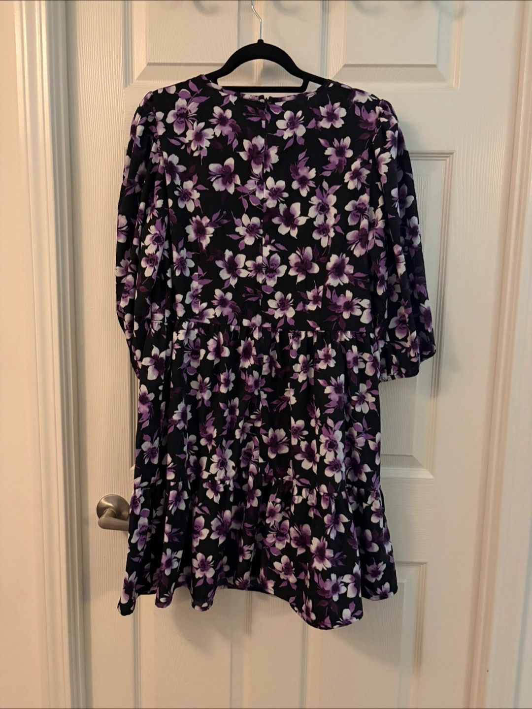 Cute purple floral mini dress. Size large. Three quarter sleeves. Tiered skirt. Polyester. Worn twice. Comes from a smoke free and pet free household. Cash only.