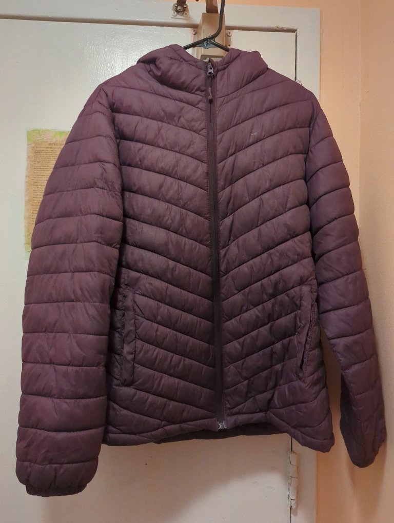 Warm puffer jacket. Features a hood and zip closure. Side pockets. Excellent for colder weather.