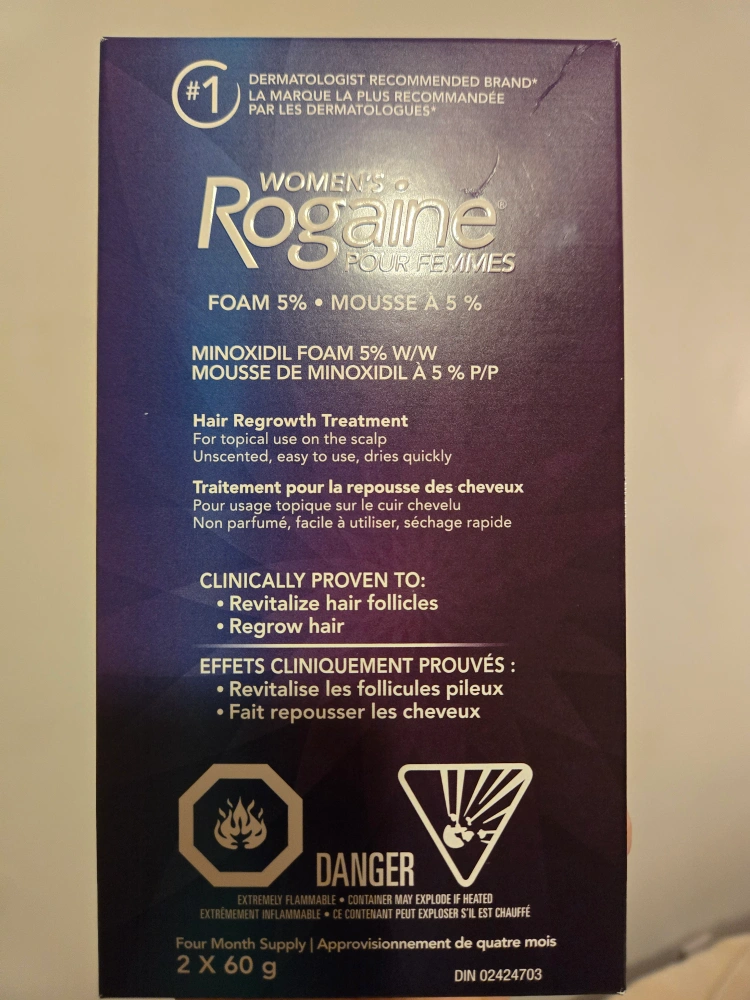 59Selling a box of Women's Rogaine Foam 5% for hair regrowth (2 x 60g). It's clinically proven to help regrow hair with topical use on the scalp. This foam is unscented and easy to use!