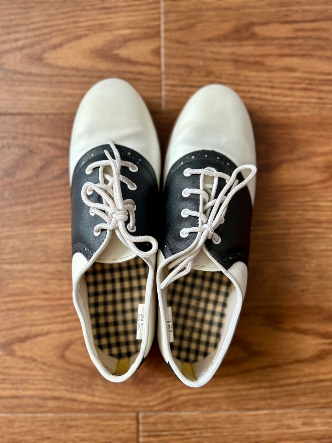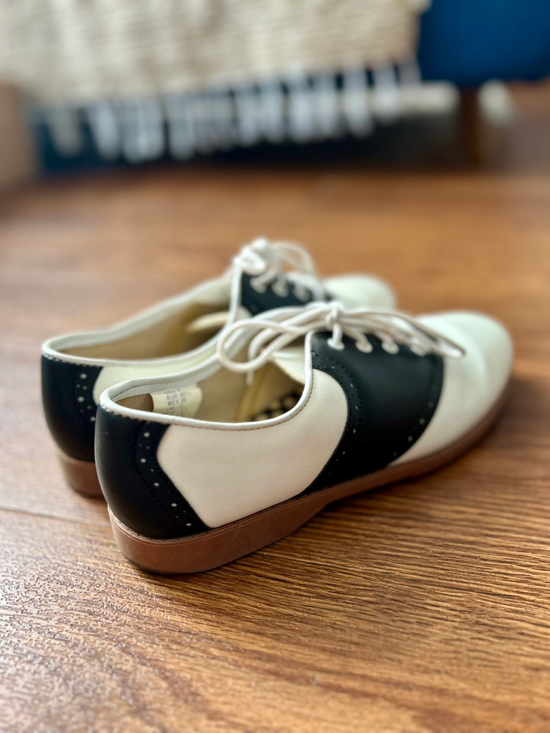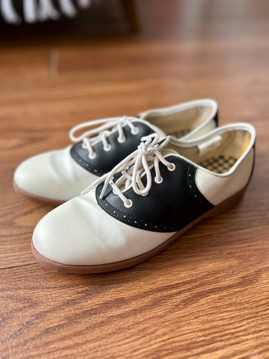 267Women’s black and white saddle shoes. Skid resistant soles. In good condition.