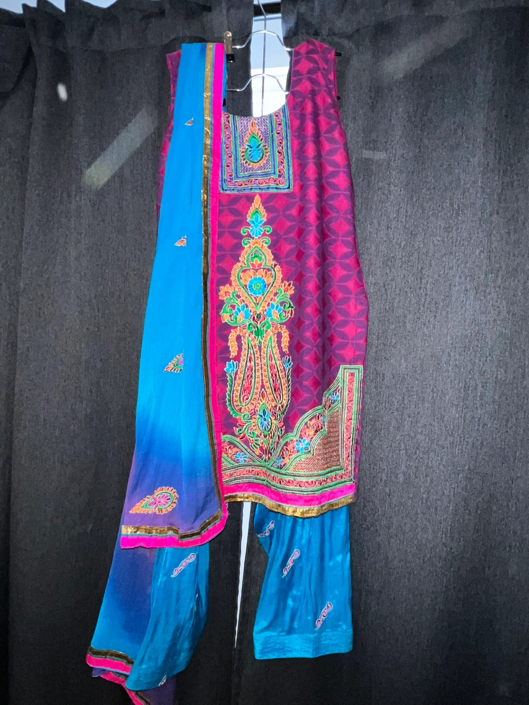 Beautiful Salwar Kameez suit in vibrant purple and blue colours! The intricate embroidery adds a touch of elegance. Perfect for a special occasion or cultural event