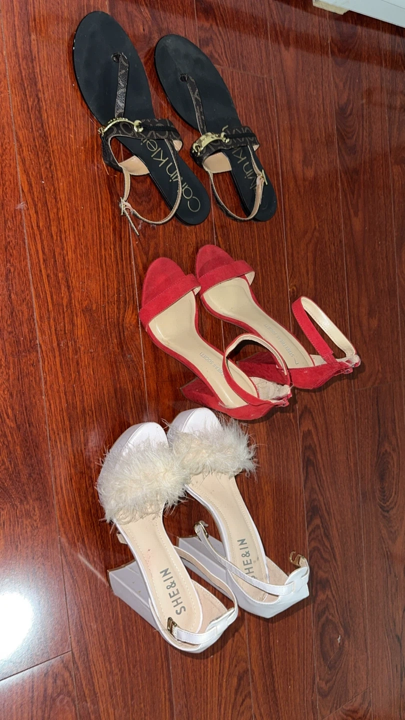 10Selling a few pairs of sandals! There's a pair of black Calvin Klein flip-flops, a pair of red heeled sandals, and a pair of white Shein heeled sandals with a feather trim. SIZE 7&8. All are only used once. All for total $20