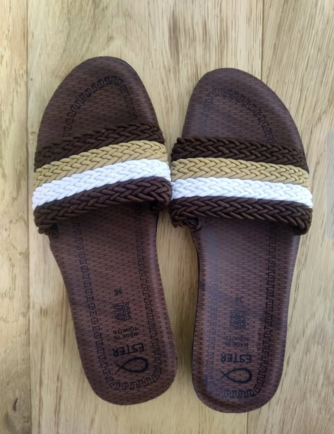 10Received from Turkey but unfortunately got the wrong size. Never worn — still in brand new condition. Selling for just $17 Beautiful woven design with neutral tones—perfect for summer or casual wear.
