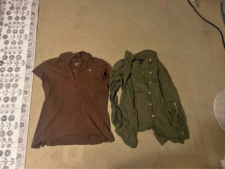 26Brown top 5$ size large, fits like a medium Green flannel 10$ size medium
