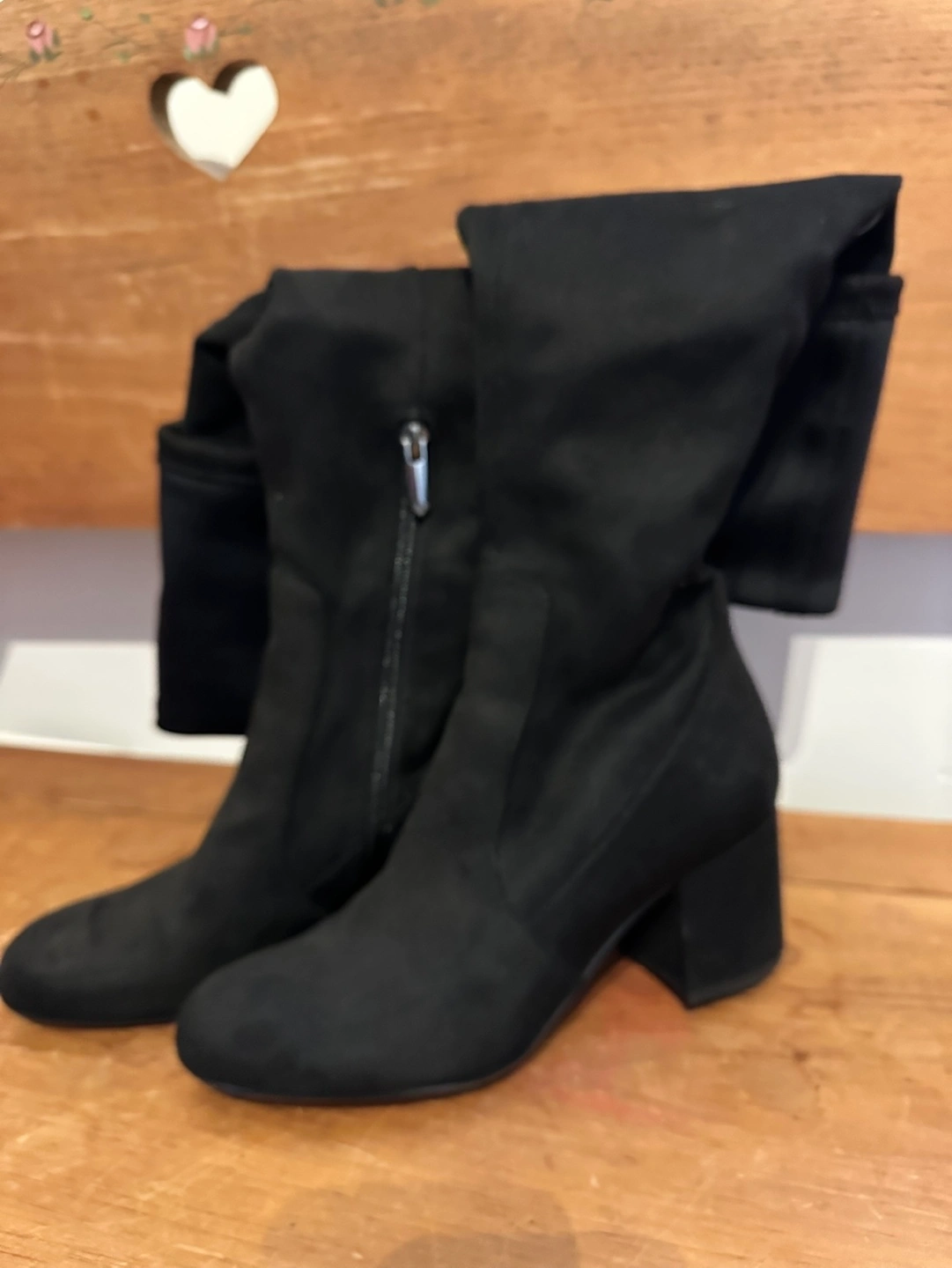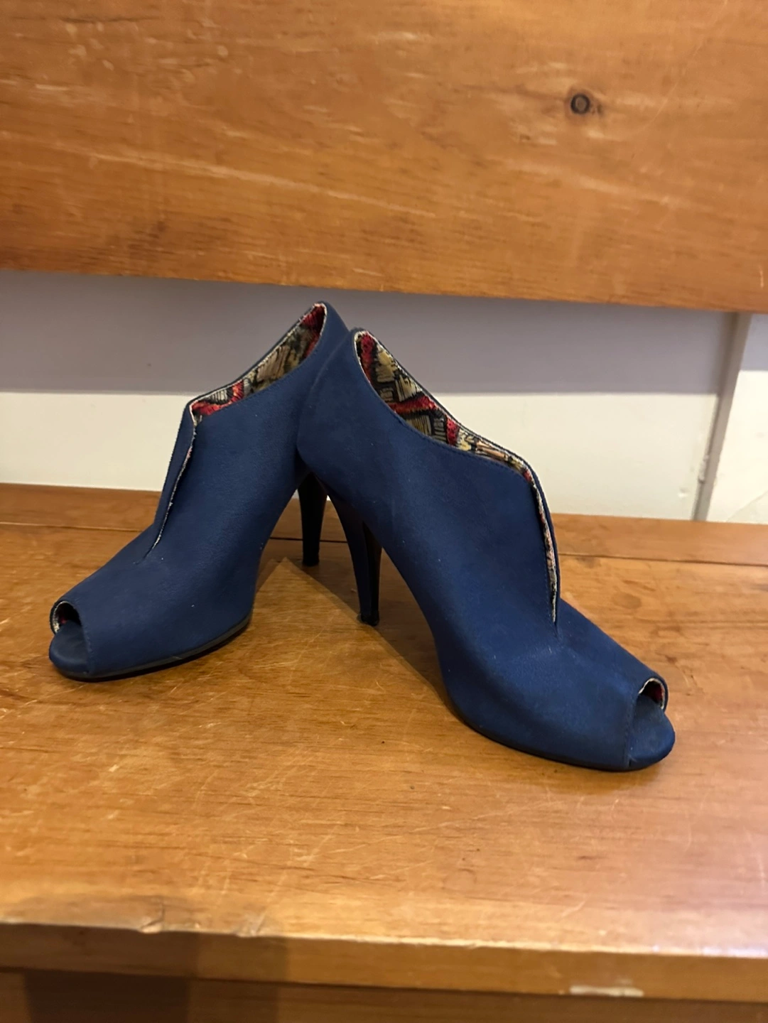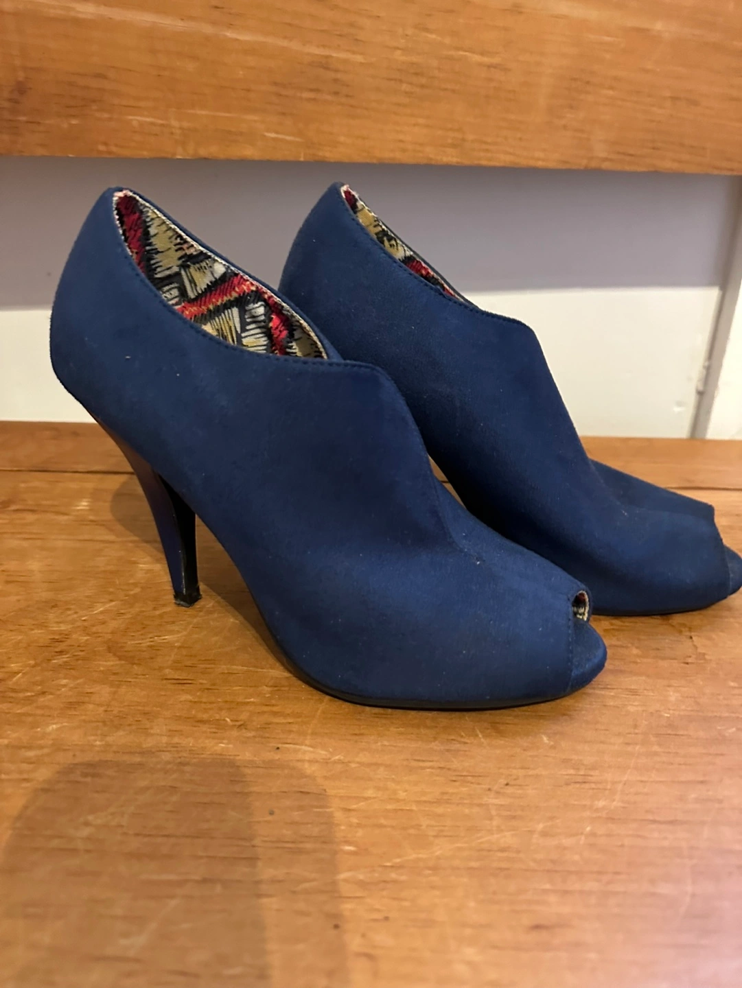 Pair of blue peep-toe heels, stiletto heels. Pair of black suede over-the-knee boots, block heels, zip closure. Another pair of black ankle boots, block heels, patent leather cap toe, zip closure.