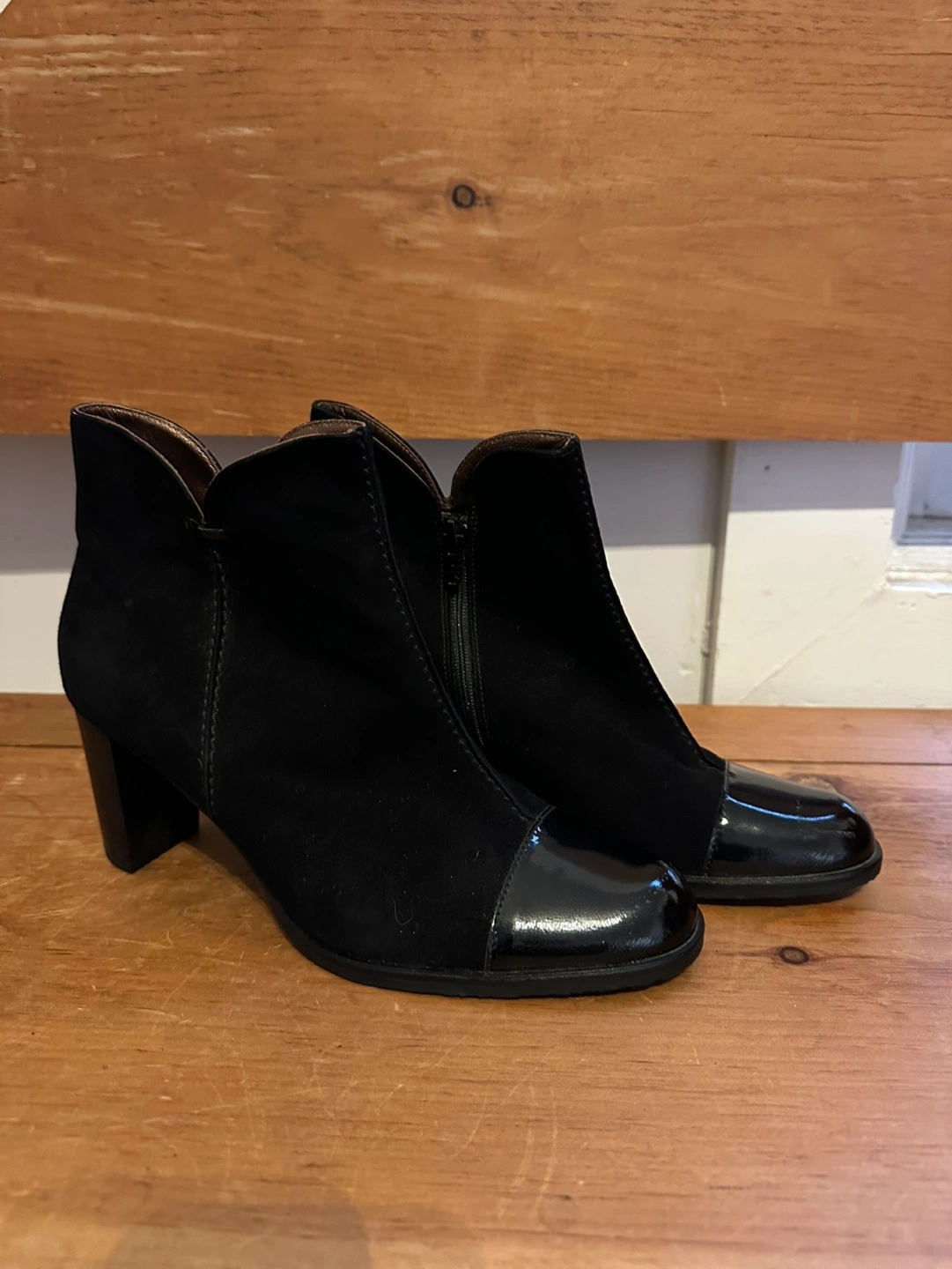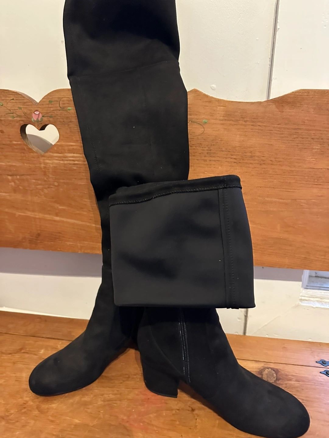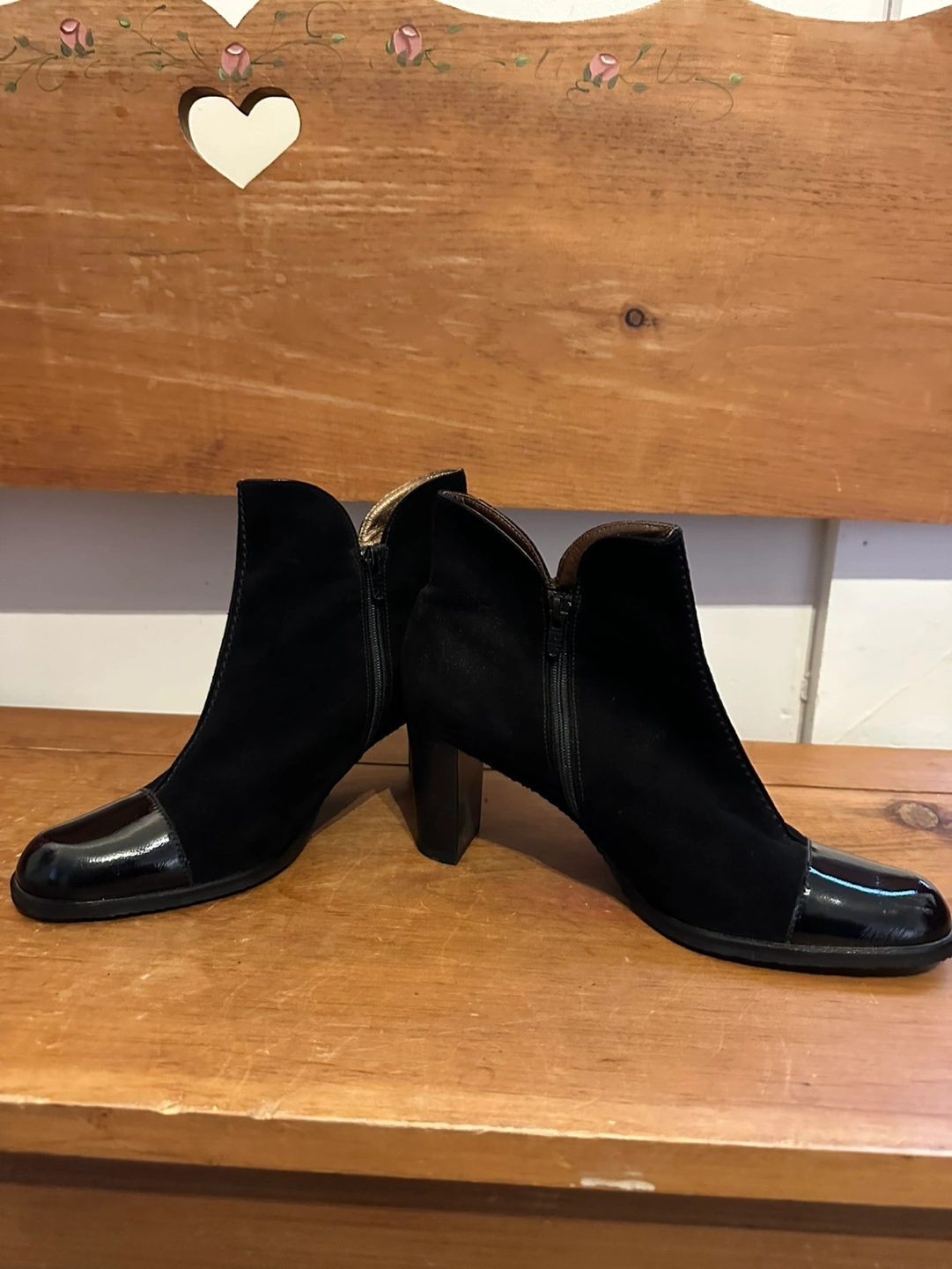 Pair of blue peep-toe heels, stiletto heels. Pair of black suede over-the-knee boots, block heels, zip closure. Another pair of black ankle boots, block heels, patent leather cap toe, zip closure.