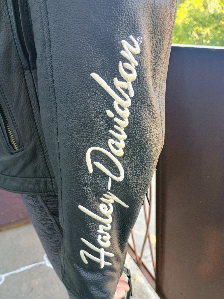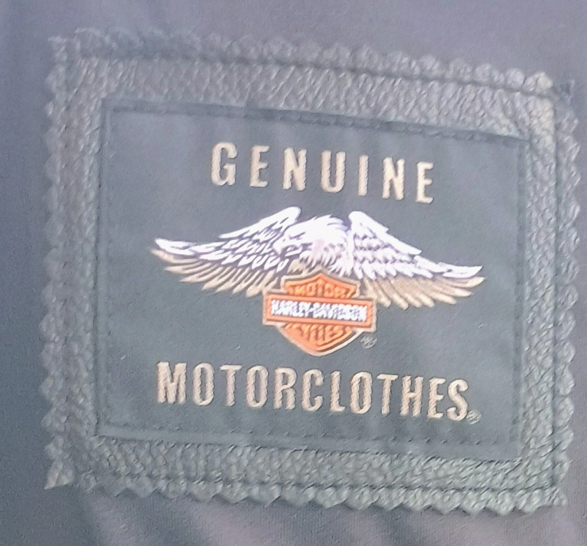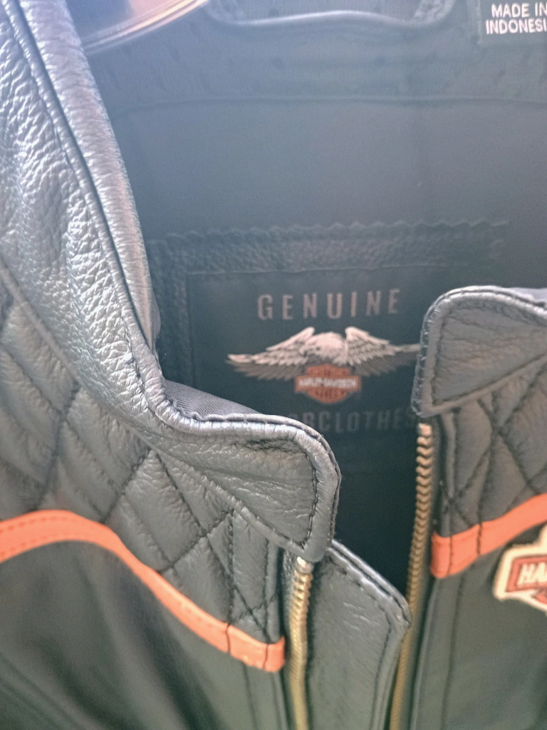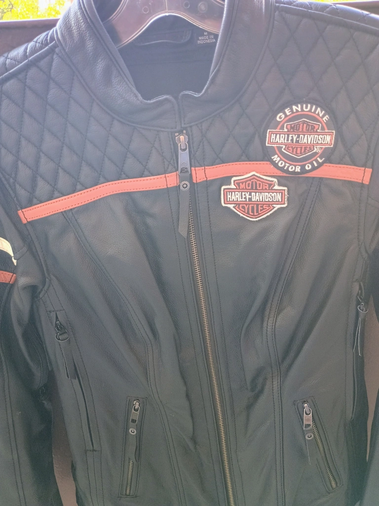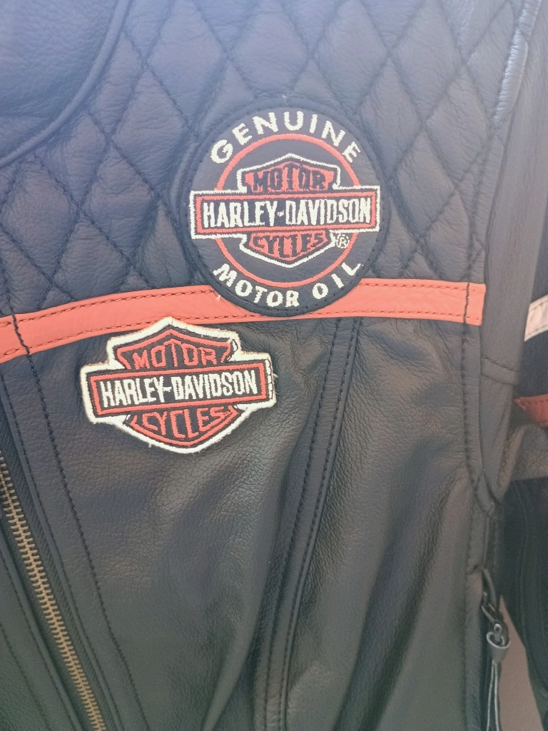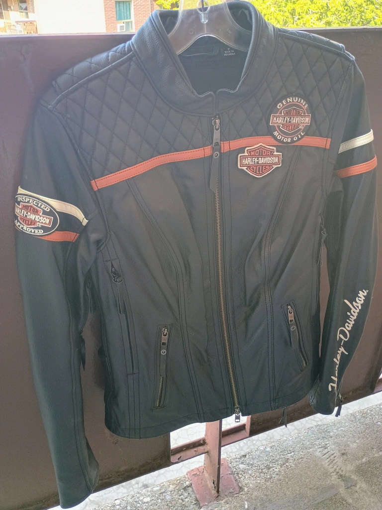 65Selling a women's size Medium Harley-Davidson leather motorcycle jacket. It has a quilted design on the upper chest and back. The jacket features the Harley-Davidson logo on the chest and sleeve, with orange accents. It's in great condition, beautiful jacket! paid over $800 at the Cambridge Harley Davidson store, only wore once no longer need it selling for $400.