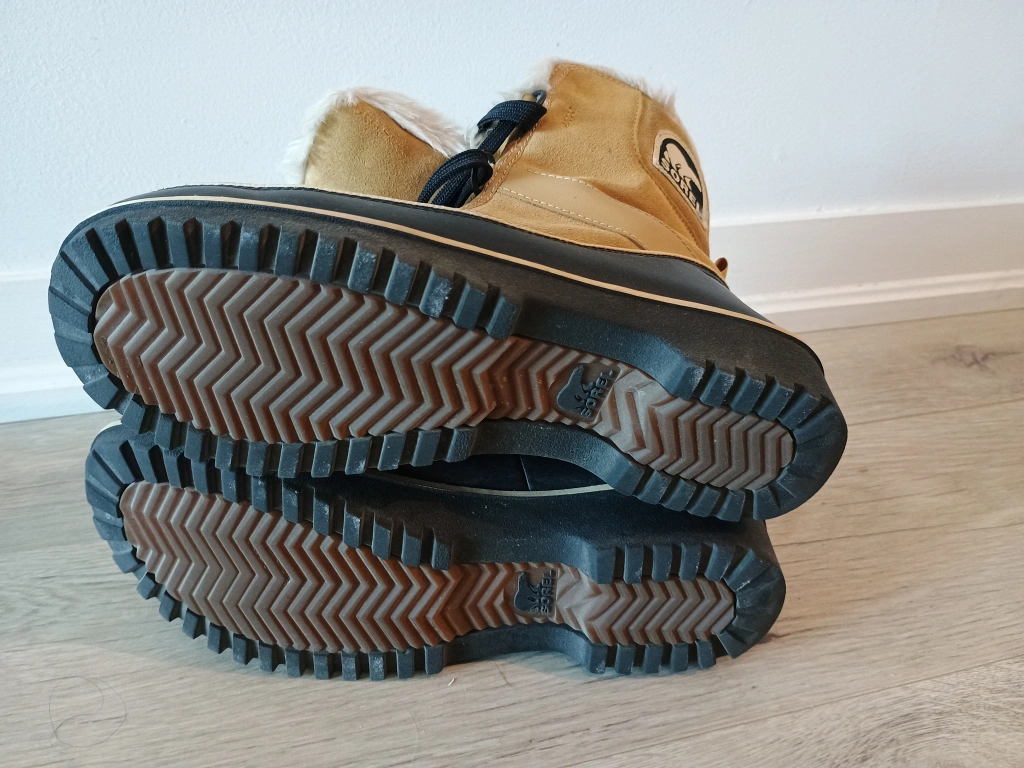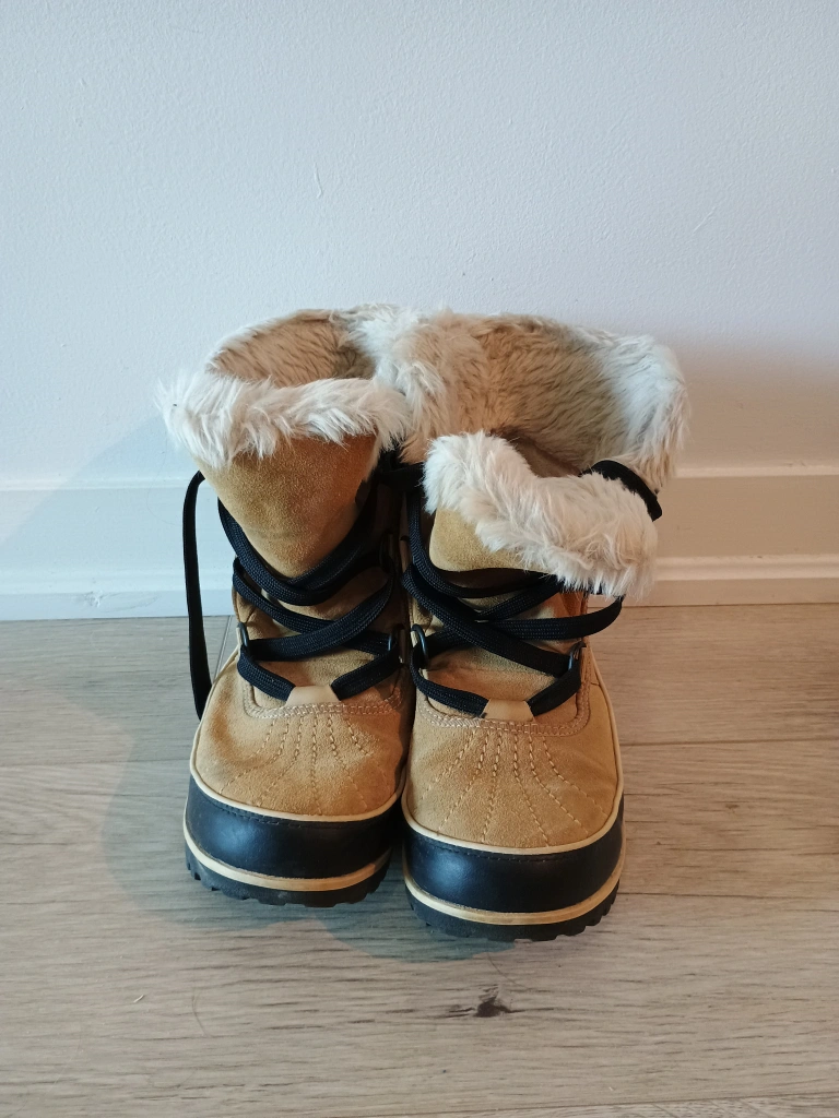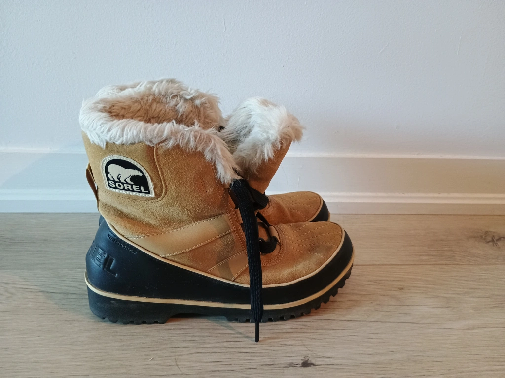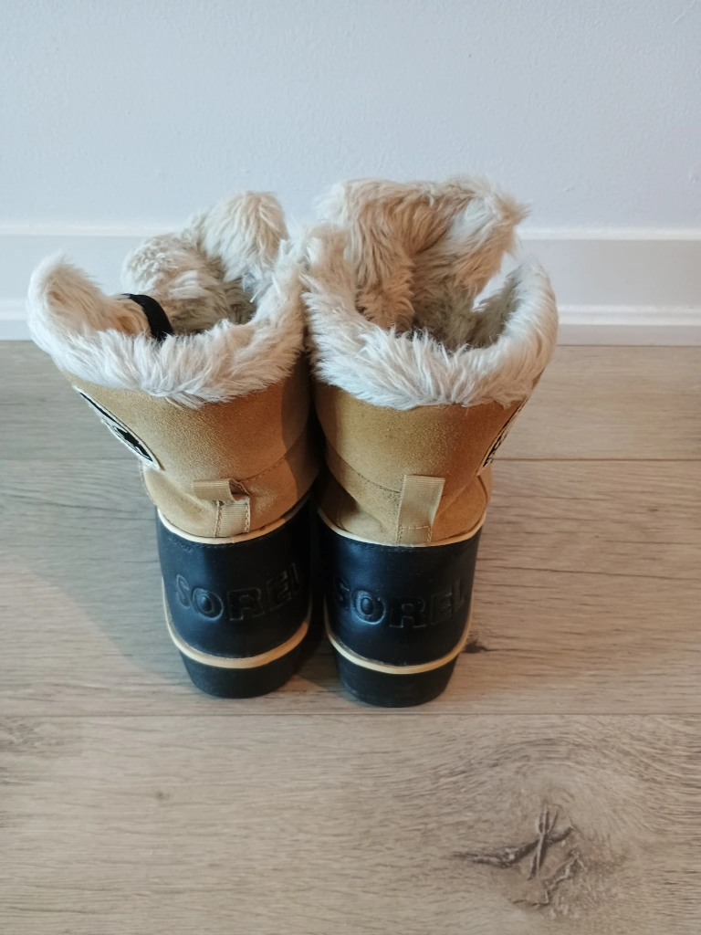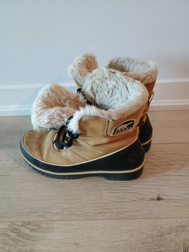 Cozy Sorel winter boots, perfect for keeping your feet warm and dry during those cold Canadian winters! In excellent condition. They feature a classic design with a tan upper, black lower, and faux fur trim. Great for snowy days and everyday wear. US size 9. Cash only, pick up only. Liberty village.