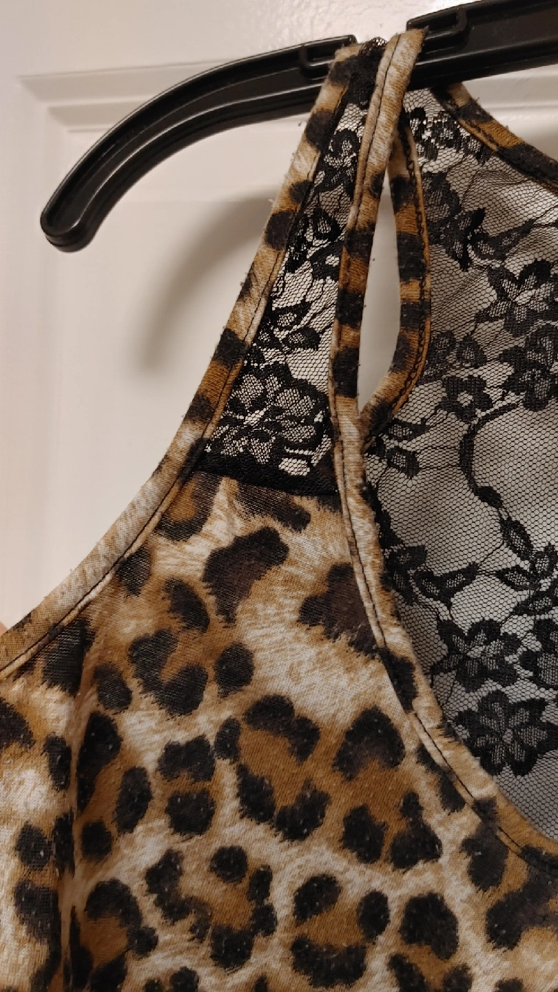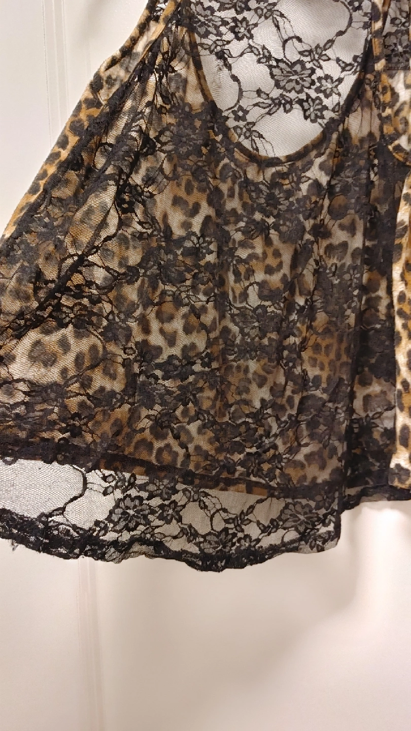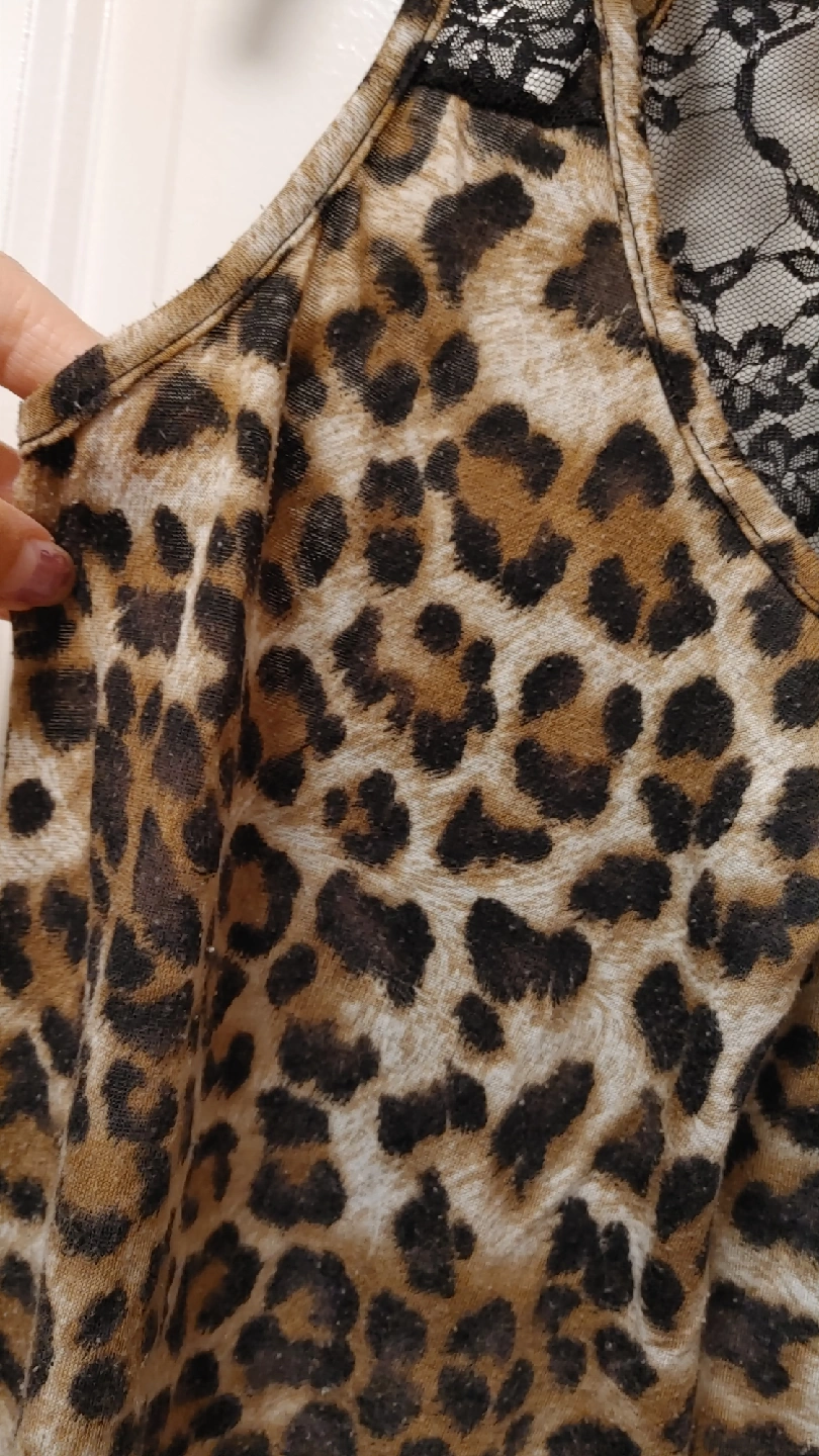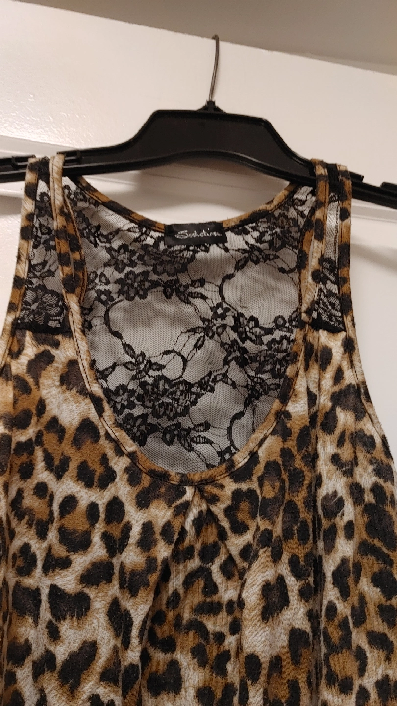 63This is a Seductions tank top with a leopard print. It has a black lace detail around the neckline and bottom hem. It's in good condition and ready for a new home