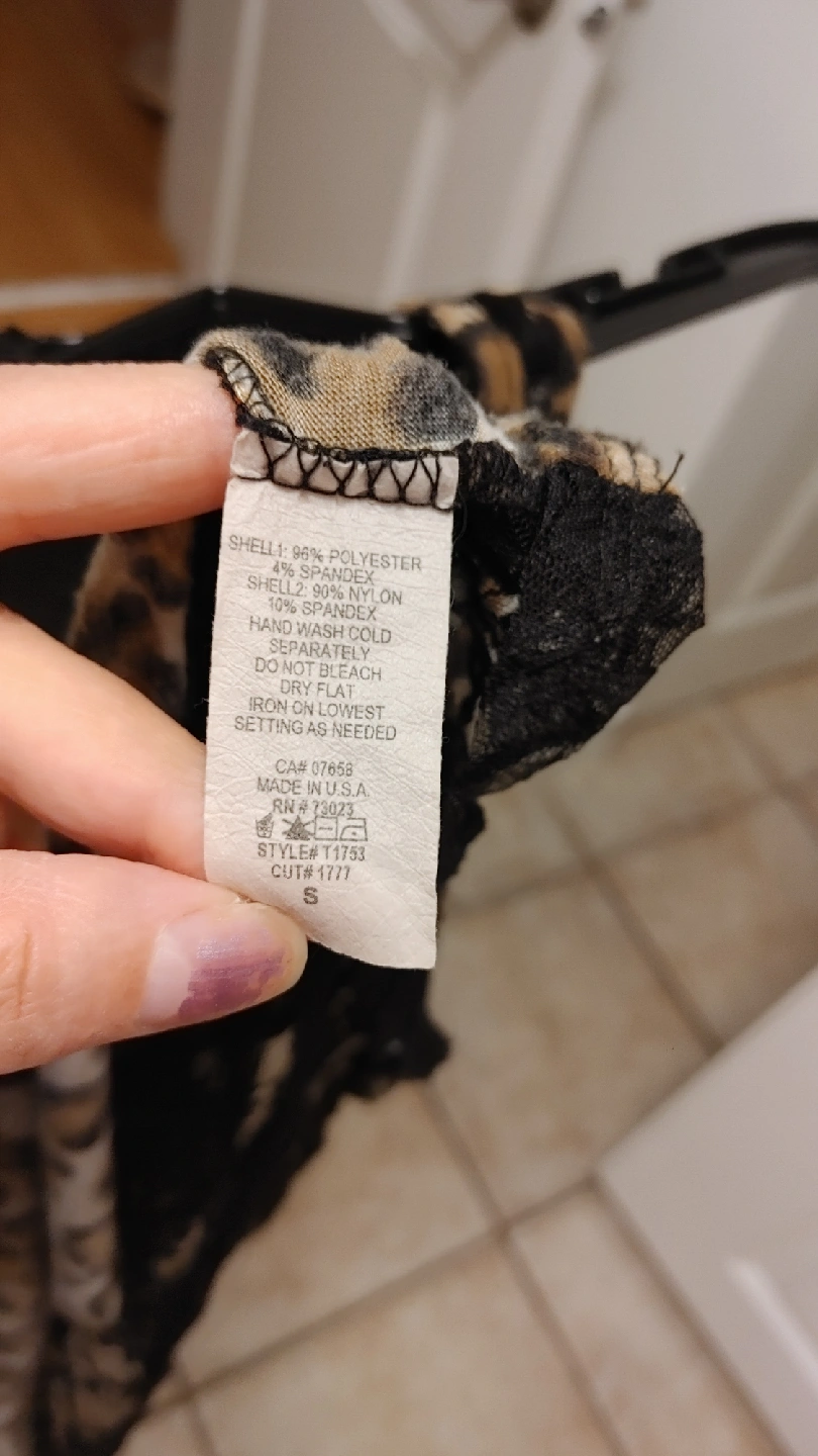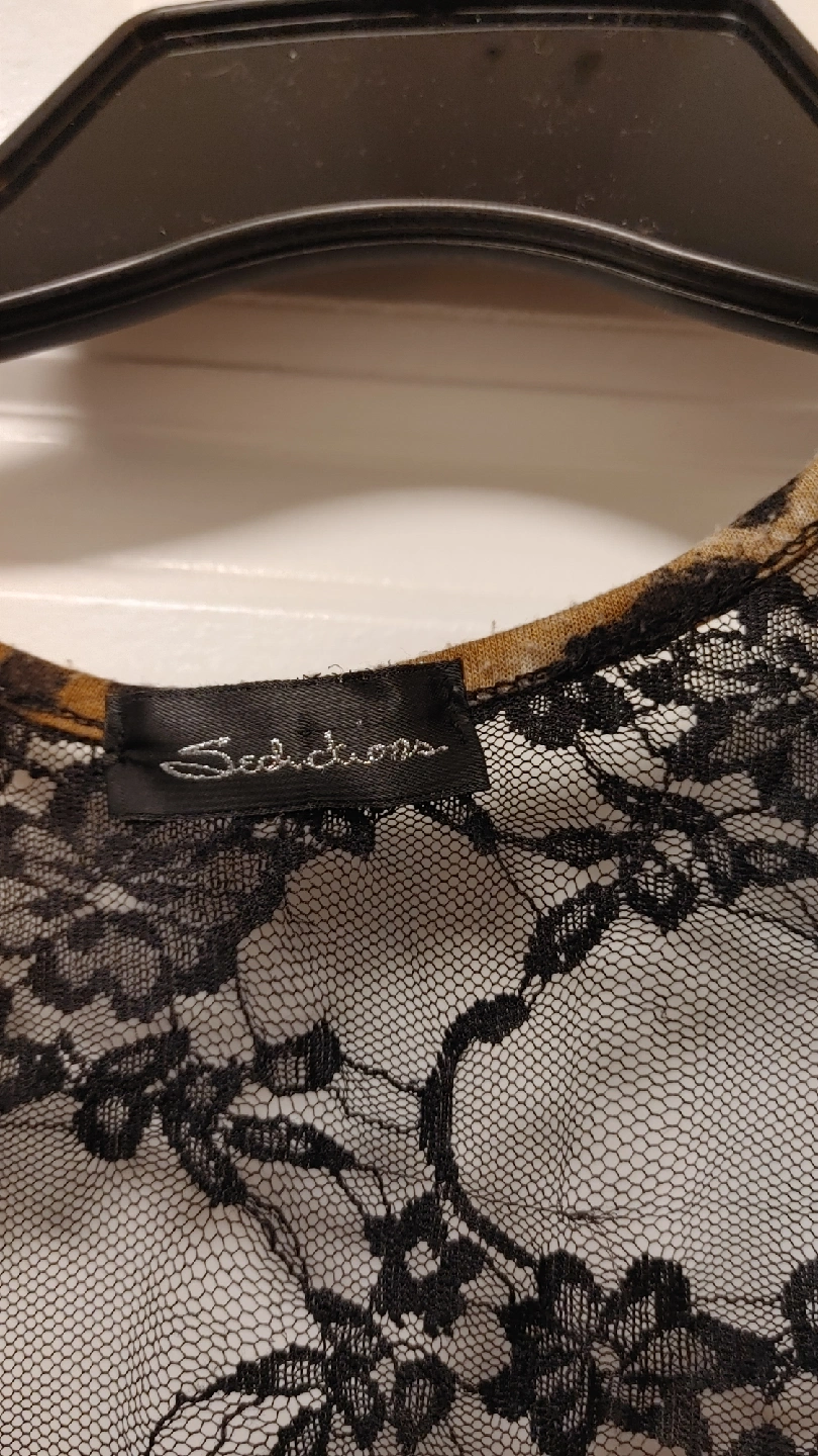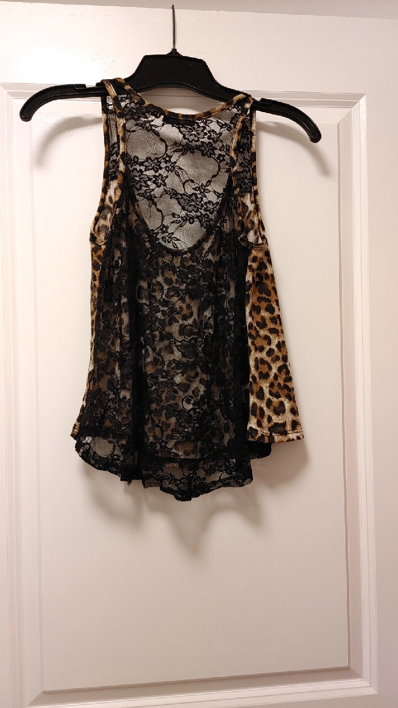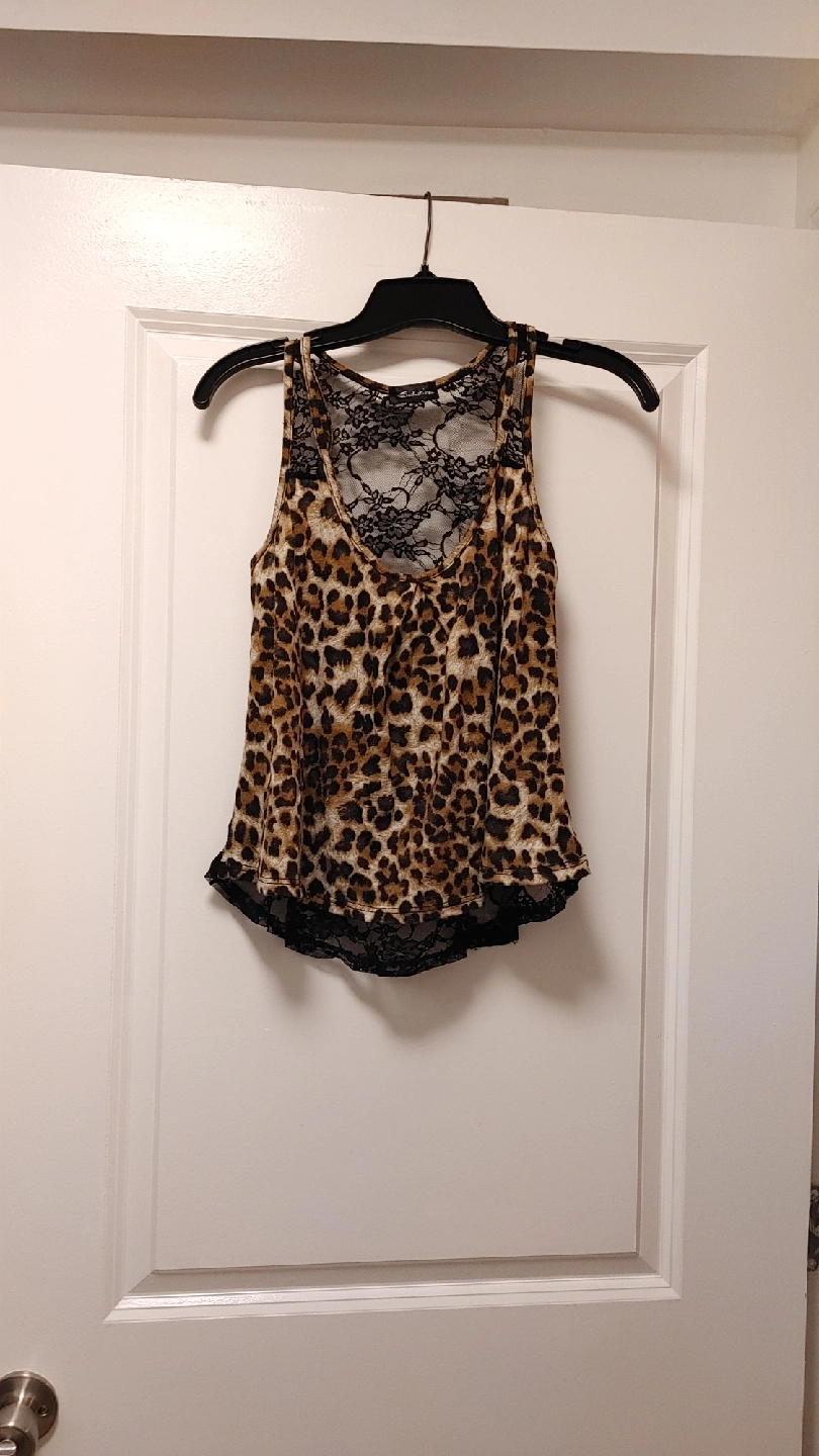 63This is a Seductions tank top with a leopard print. It has a black lace detail around the neckline and bottom hem. It's in good condition and ready for a new home