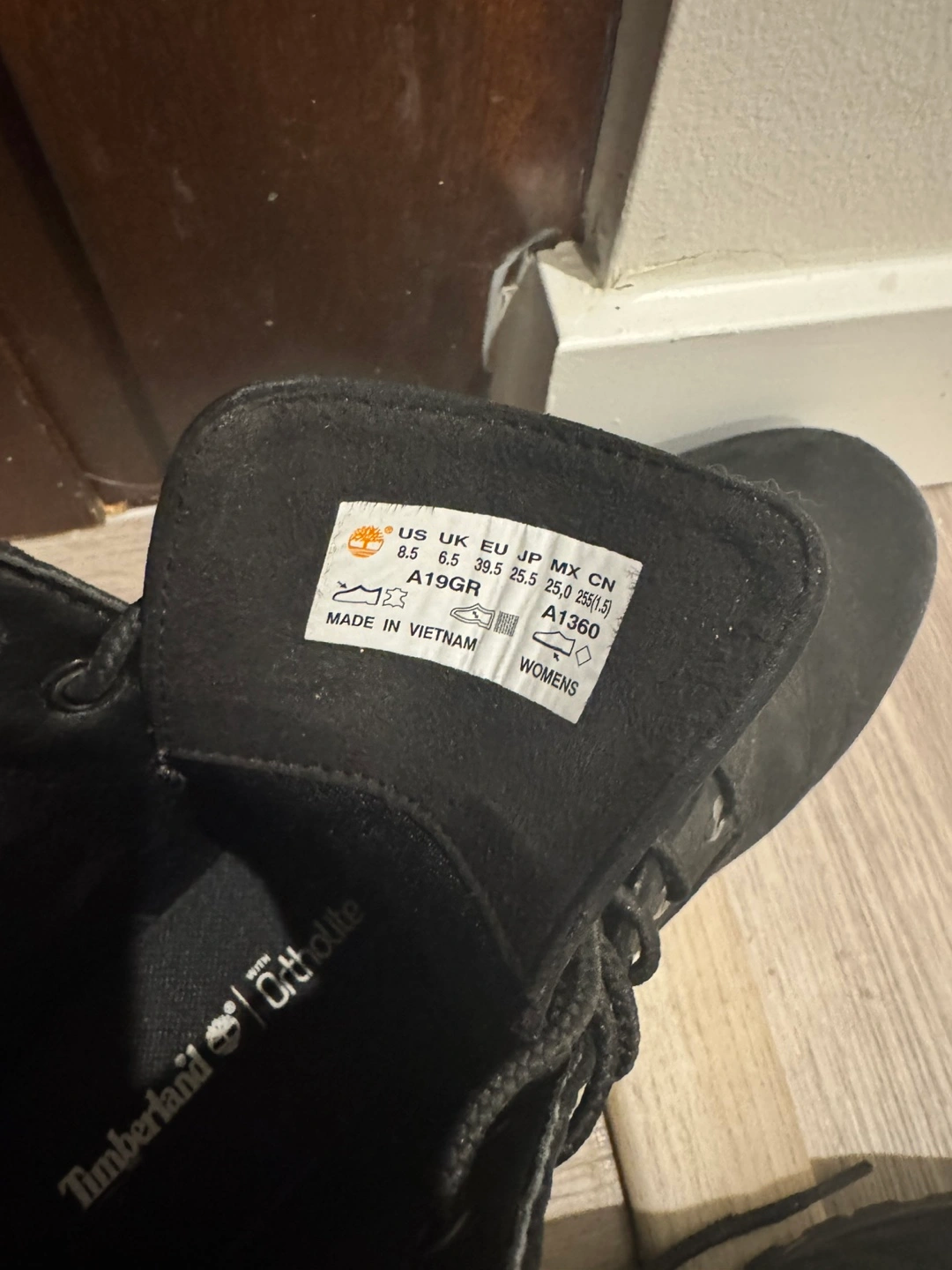 34Pair of black Timberland boots. Women's size 8.5. Lace-up style. Made in Vietnam.