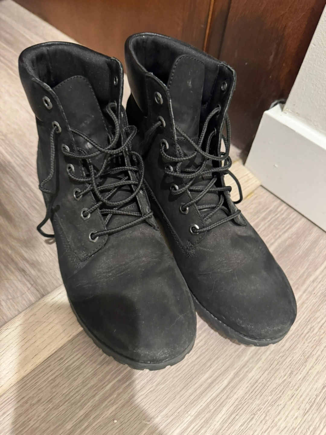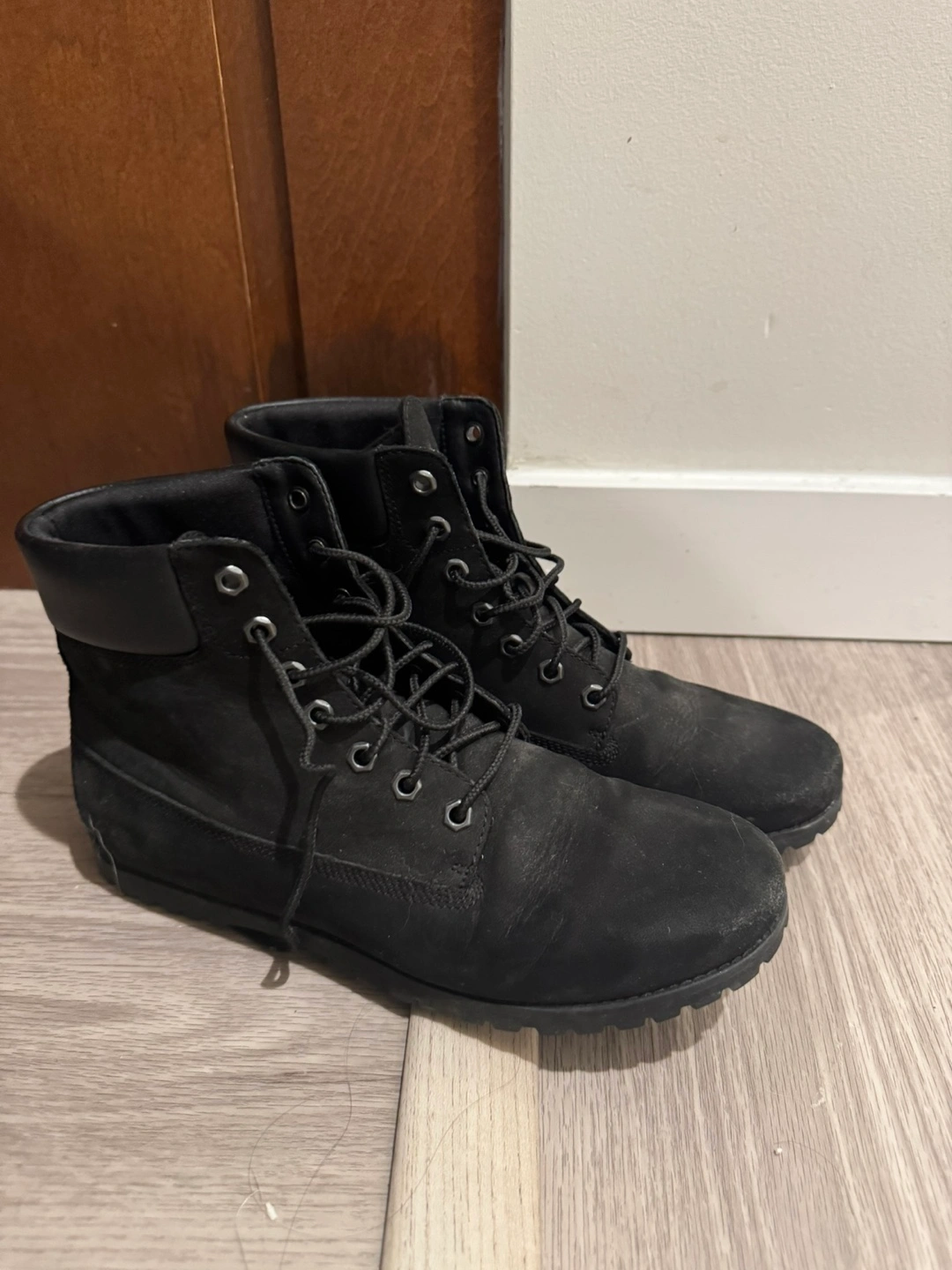 34Pair of black Timberland boots. Women's size 8.5. Lace-up style. Made in Vietnam.
