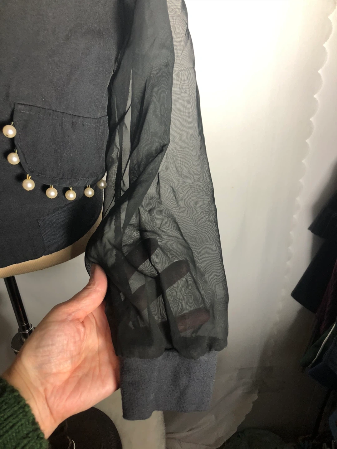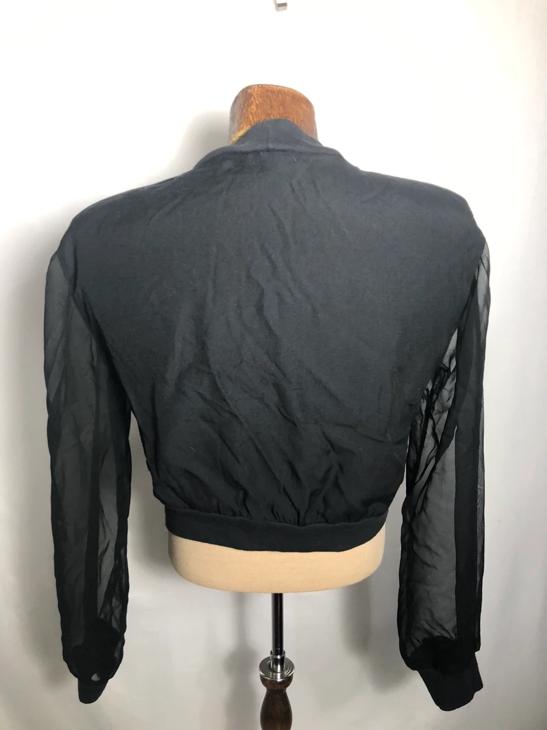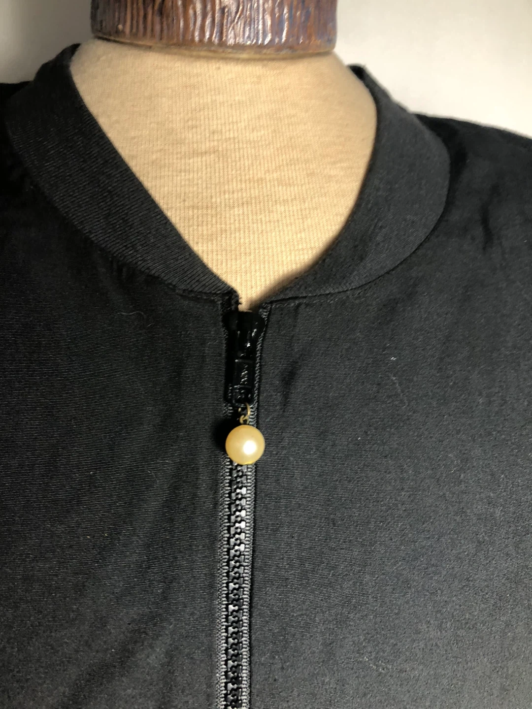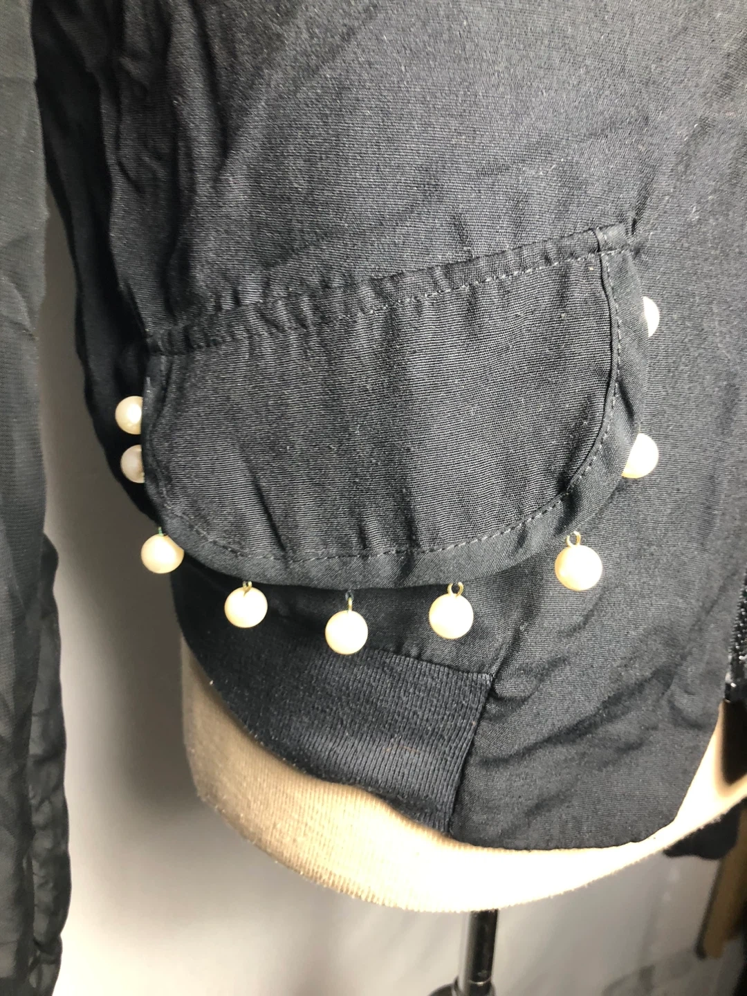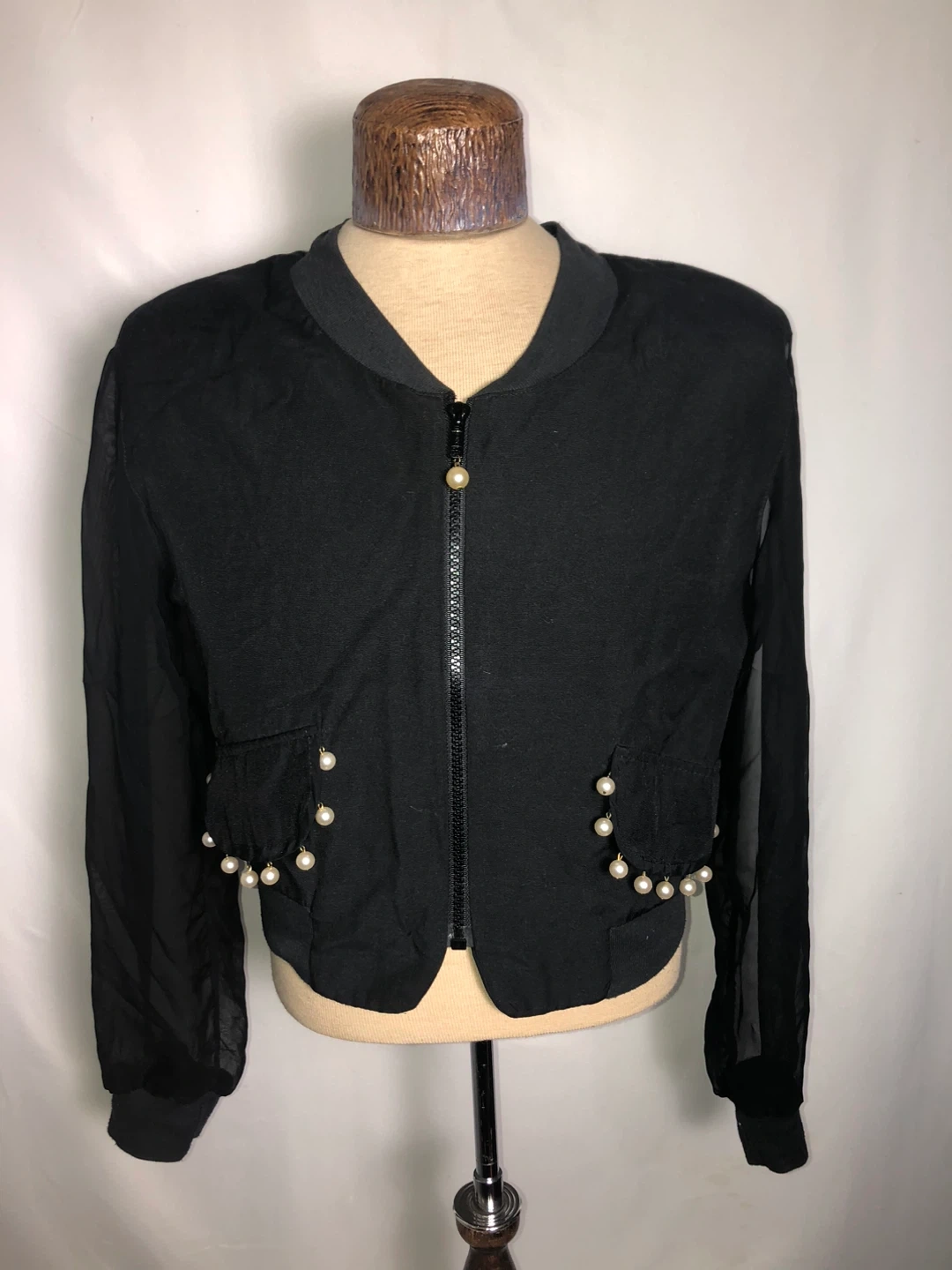 54Women’s Vintage LeChateau Black Jacket with Faux Pearls. Size Small. 20” pit to pit. 19” overall length Sheer sleeves. Pearl on zipper. $10 Cash or e-transfer Coliseum Area / Elmwood Park Shipping extra