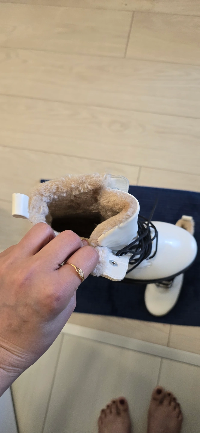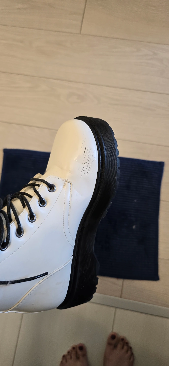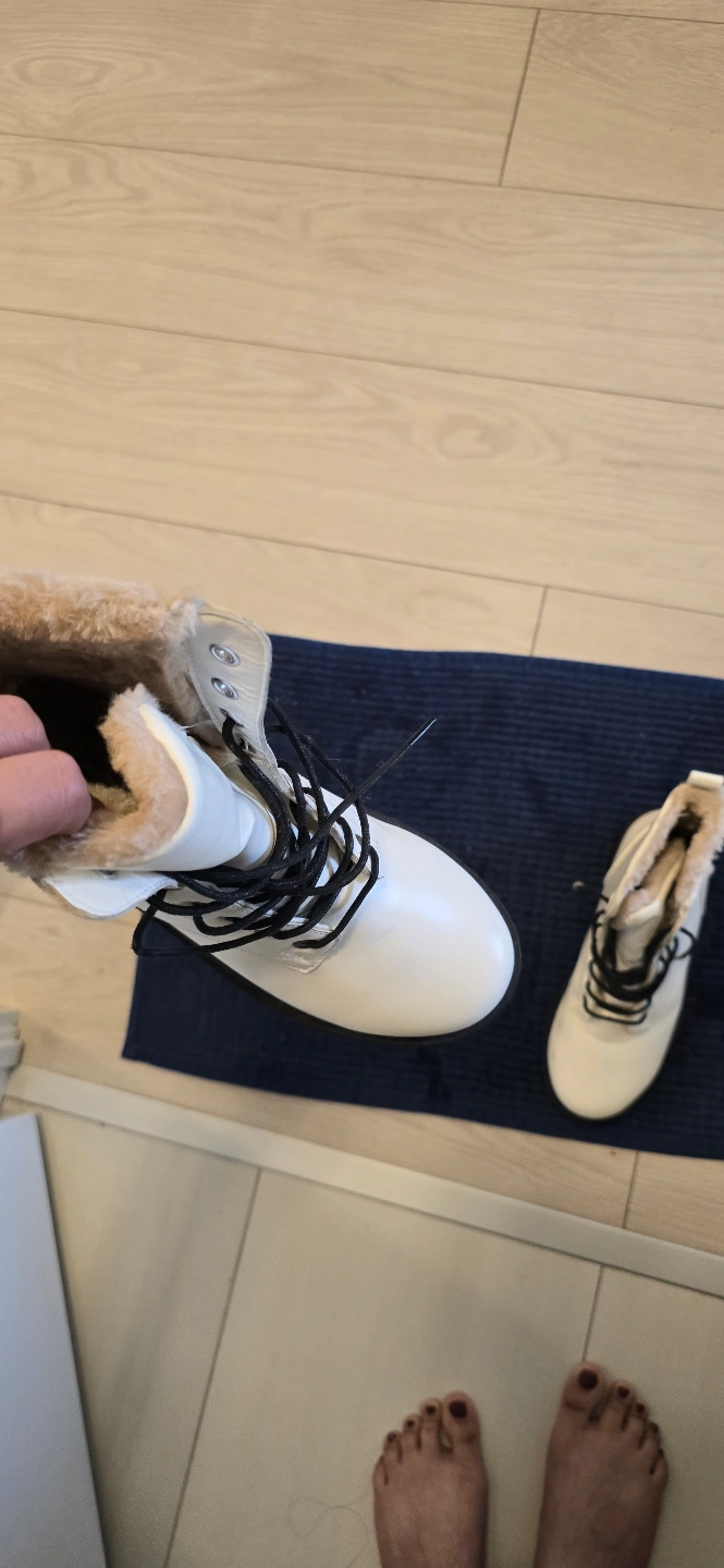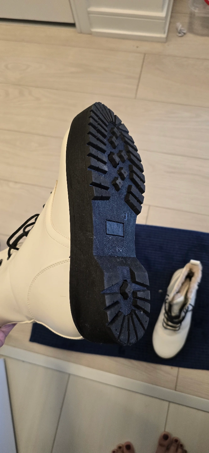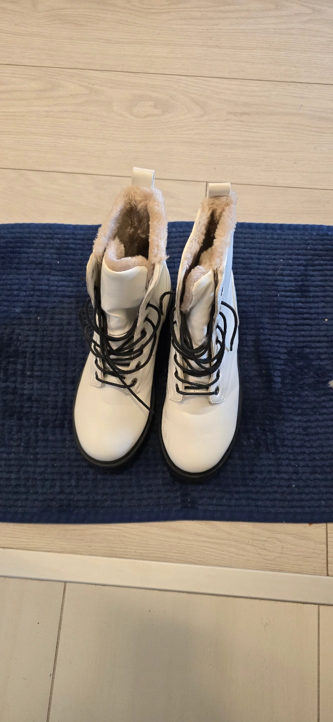 88Creamy white faux leather boots. Lace-up closure. Features a warm faux fur interior. Chunky black sole. Some minor scuffs visible.
