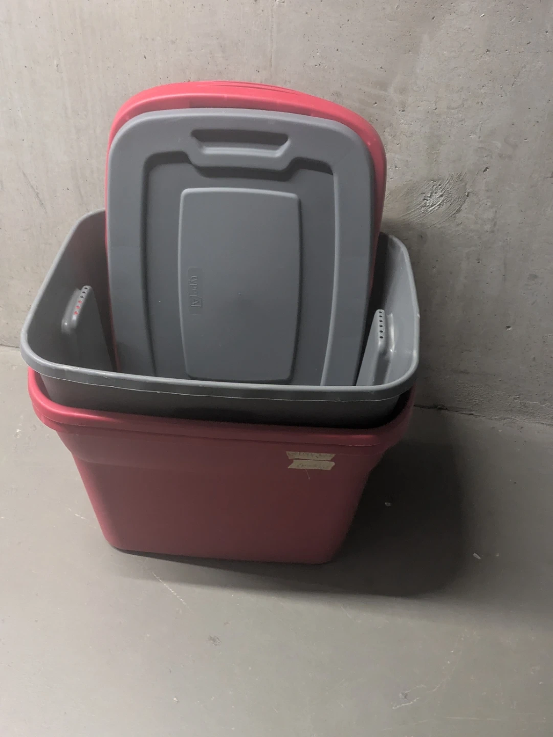 Two plastic storage bins, one red and one grey. Both come with lids. Useful for organizing.