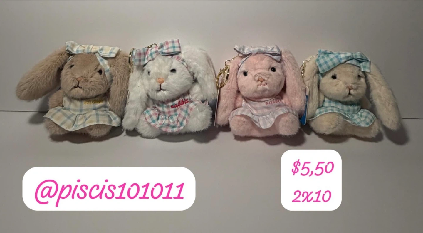 Cute plush bunny keychains! Each bunny is wearing a plaid dress and bow. They're soft and perfect for decorating bags or backpacks. Assorted colors available.
