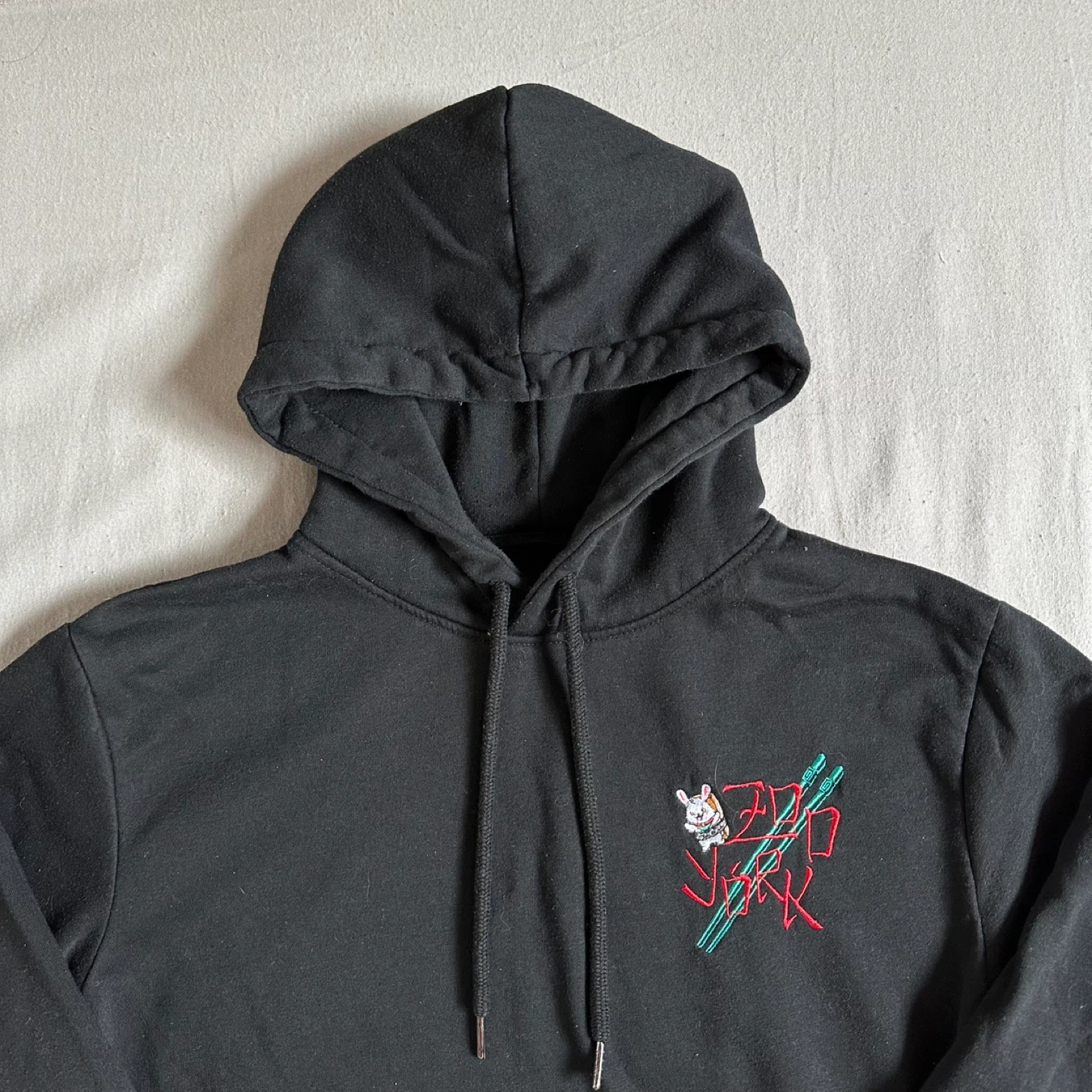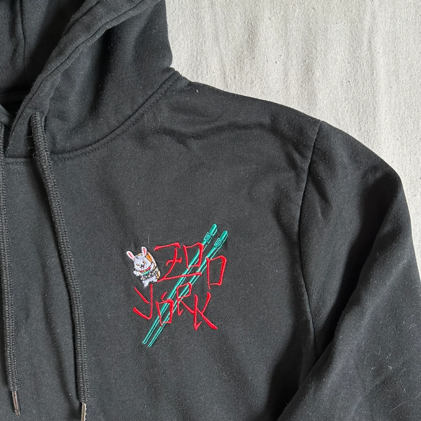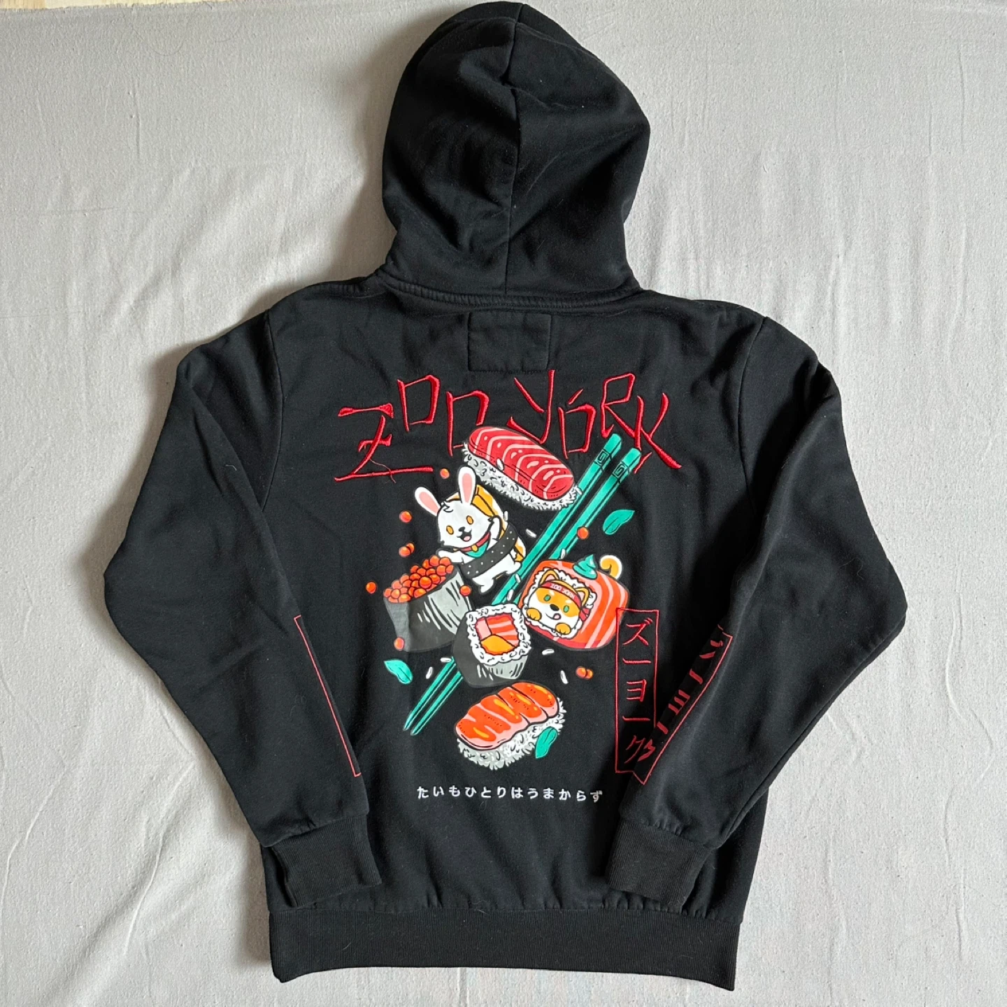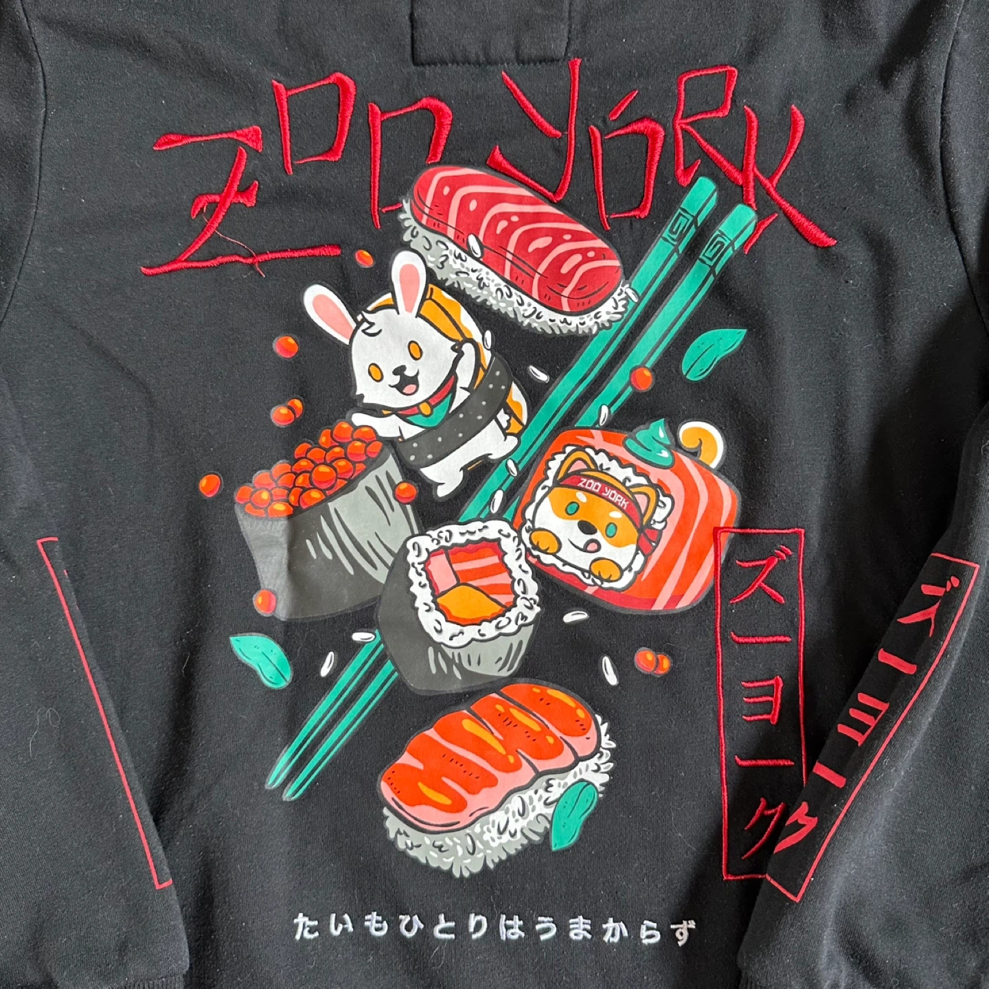 Black Zoo York hoodie featuring a colourful sushi graphic with rabbits and shiba inu. Made from 50% polyester and 50% cotton. Size S/P.