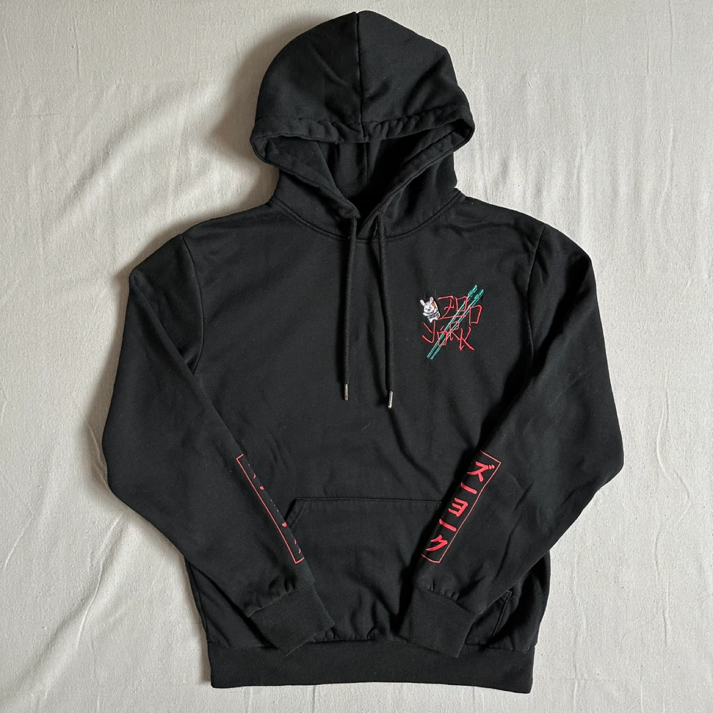 Black Zoo York hoodie featuring a colourful sushi graphic with rabbits and shiba inu. Made from 50% polyester and 50% cotton. Size S/P.