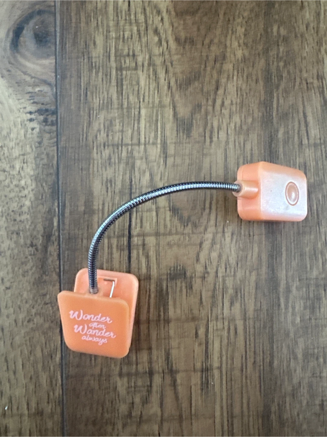 This clip-on book light is perfect for reading in bed or on the go! It says "Wonder open Wander always" on the clip. It's in great shape and ready to brighten up your reading experience