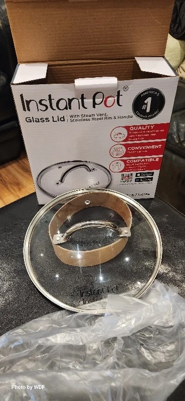 This is an Instant Pot glass lid with a steam vent, stainless steel rim, and handle. It's compatible with 6 Quart and 5.7 Litre Instant Pot pressure cookers. This lid is dishwasher safe for convenient cleaning.