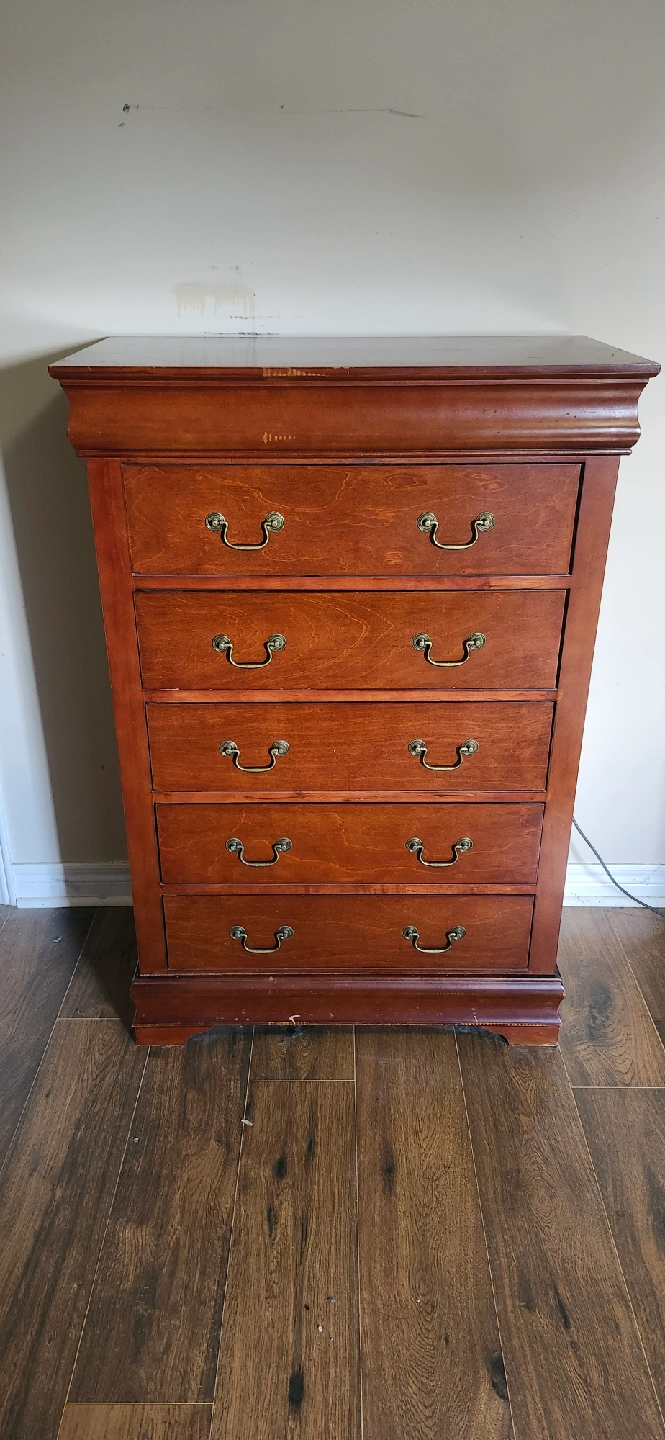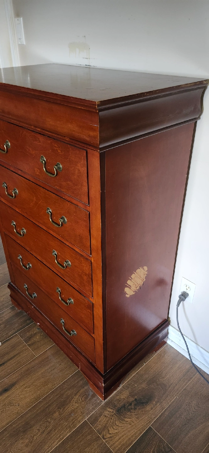Selling a wood dresser with 5 drawers. It has a classic look with brass-tone handles. There are some signs of wear, including a spot on the side where the finish is damaged, but it's still a functional piece of furniture for storage