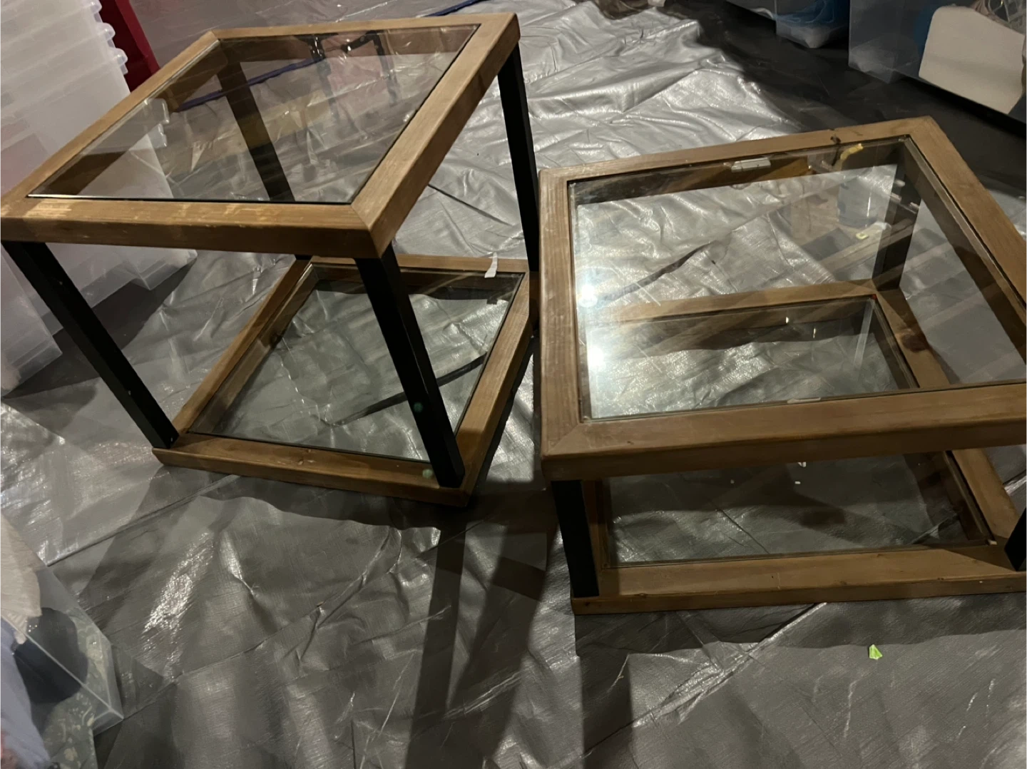 83Selling a set of two side tables! They feature a wooden frame with glass tops and black metal supports. Great for adding a touch of modern rustic charm to any room. They're in great condition and ready for a new home Big one :20cm*20cm , high: 18cm Small one : 20cm*20cm, high: 12cm