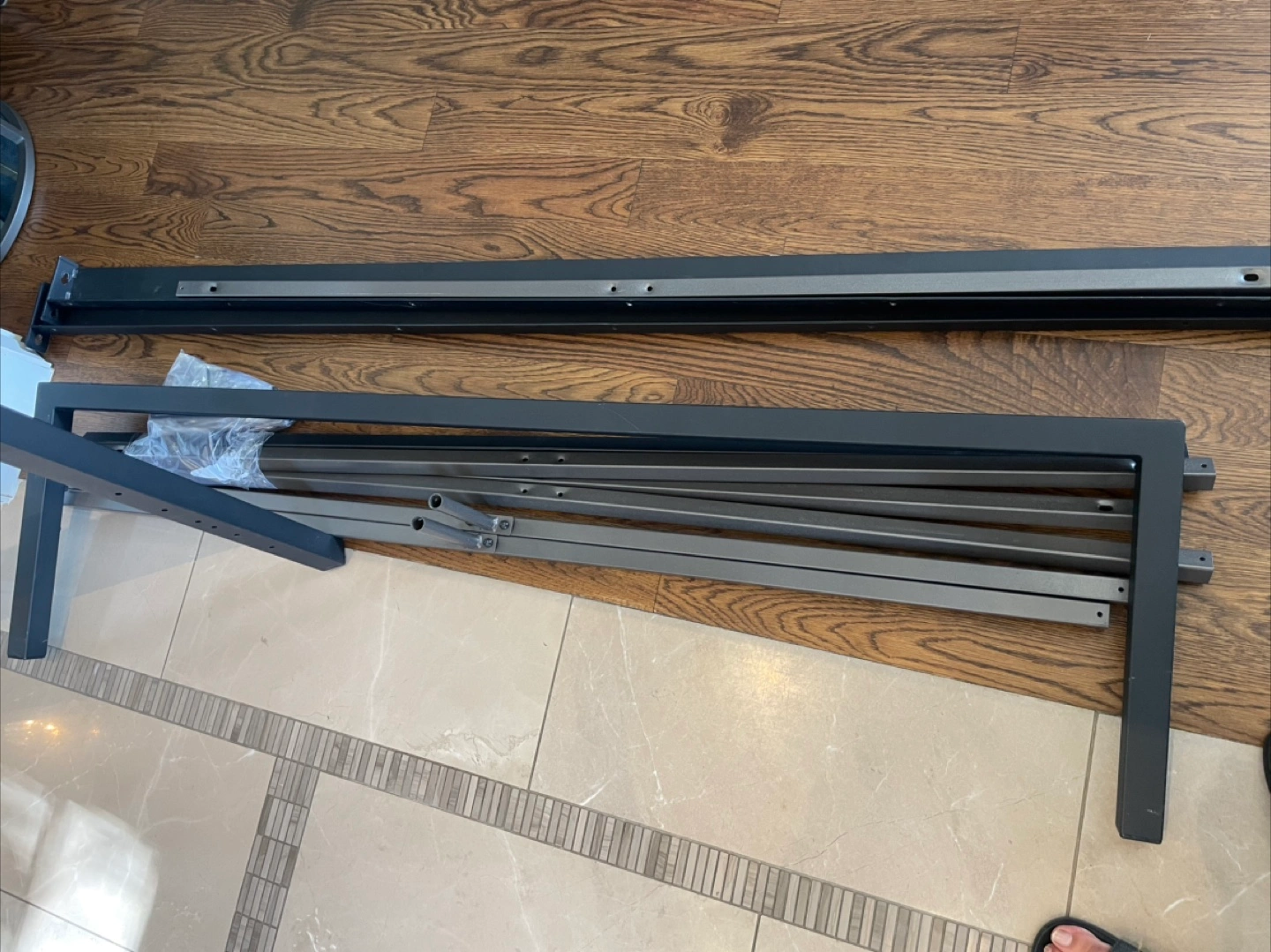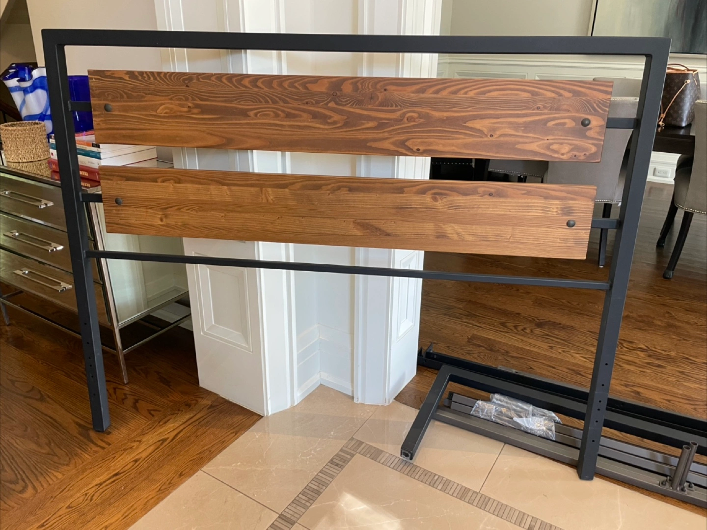 Selling a queen-size headboard with a rustic wood and black metal frame. It's in great condition and ready to add some style to your bedroom. All the necessary pieces for assembly are included!