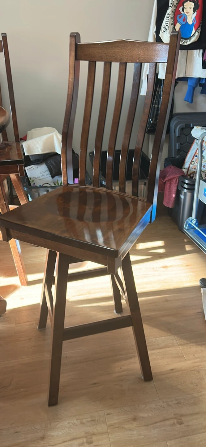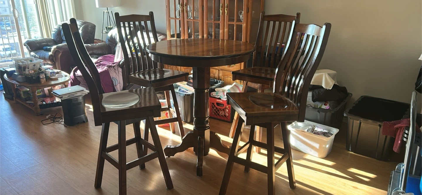 Selling a wood bar table with four chairs. The set is in good condition and would be a great addition to any kitchen or dining area. The chairs have a nice back support and swivel for easy movement.