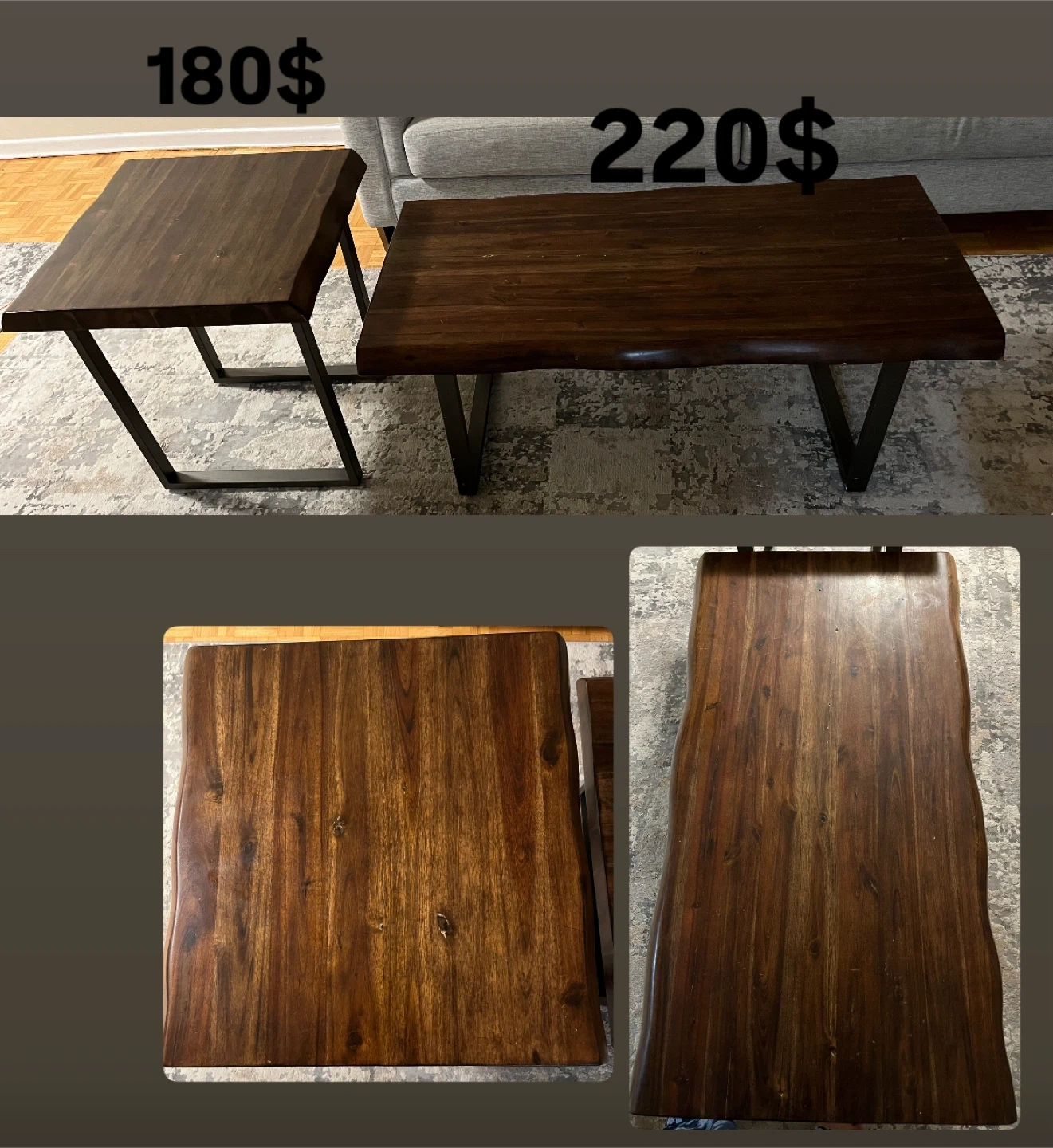 76Selling a beautiful wood coffee table and matching end table set. The coffee table is priced at $220 and the end table at $180. They have a lovely natural wood finish and sturdy metal legs. Great for adding a rustic touch to your living room!