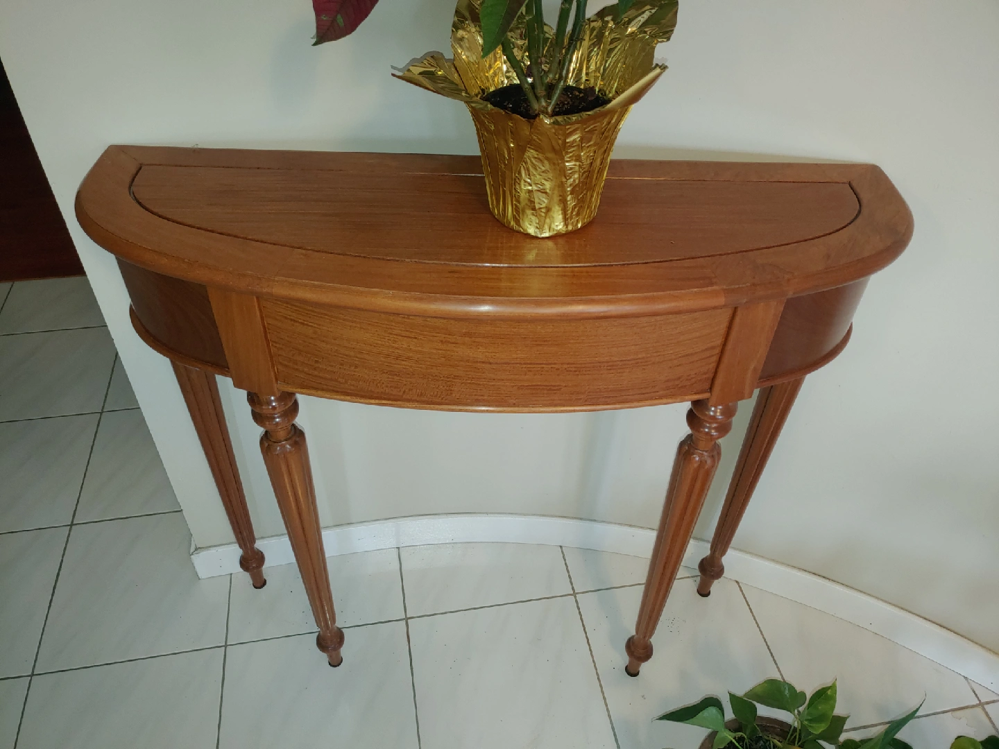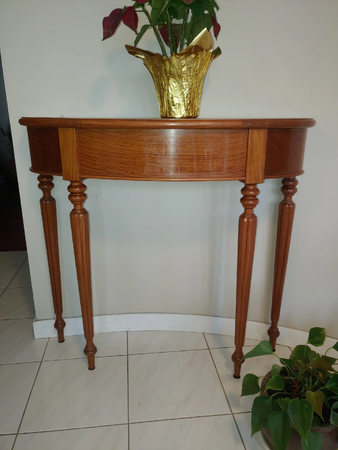 A lovely wood console table, perfect for adding a touch of warmth to your entryway or living room. It features a classic design with elegantly turned legs and a smooth, semi-circular top. The table also includes a convenient drawer for storing small items. It's in great condition and ready to find a new home