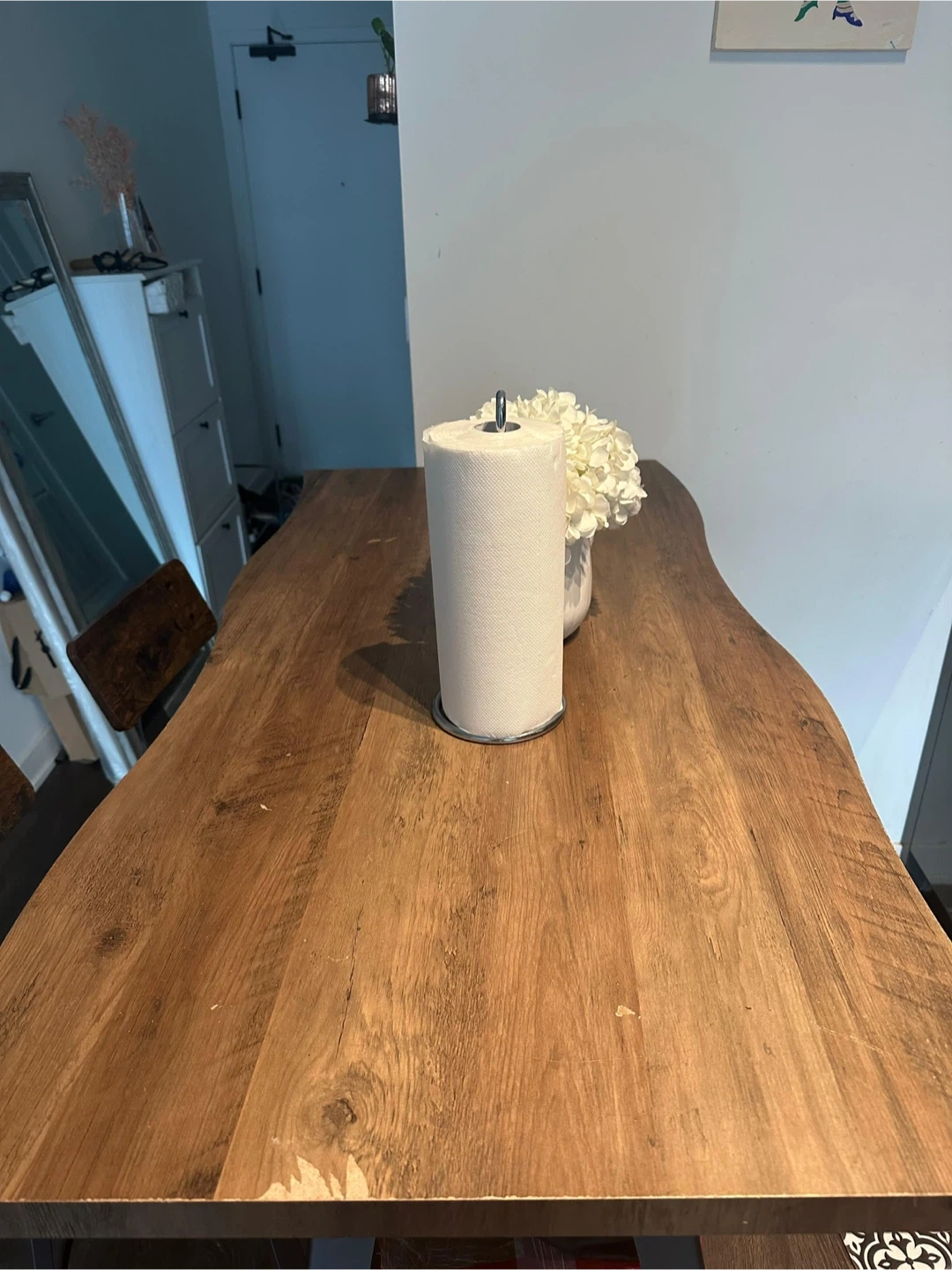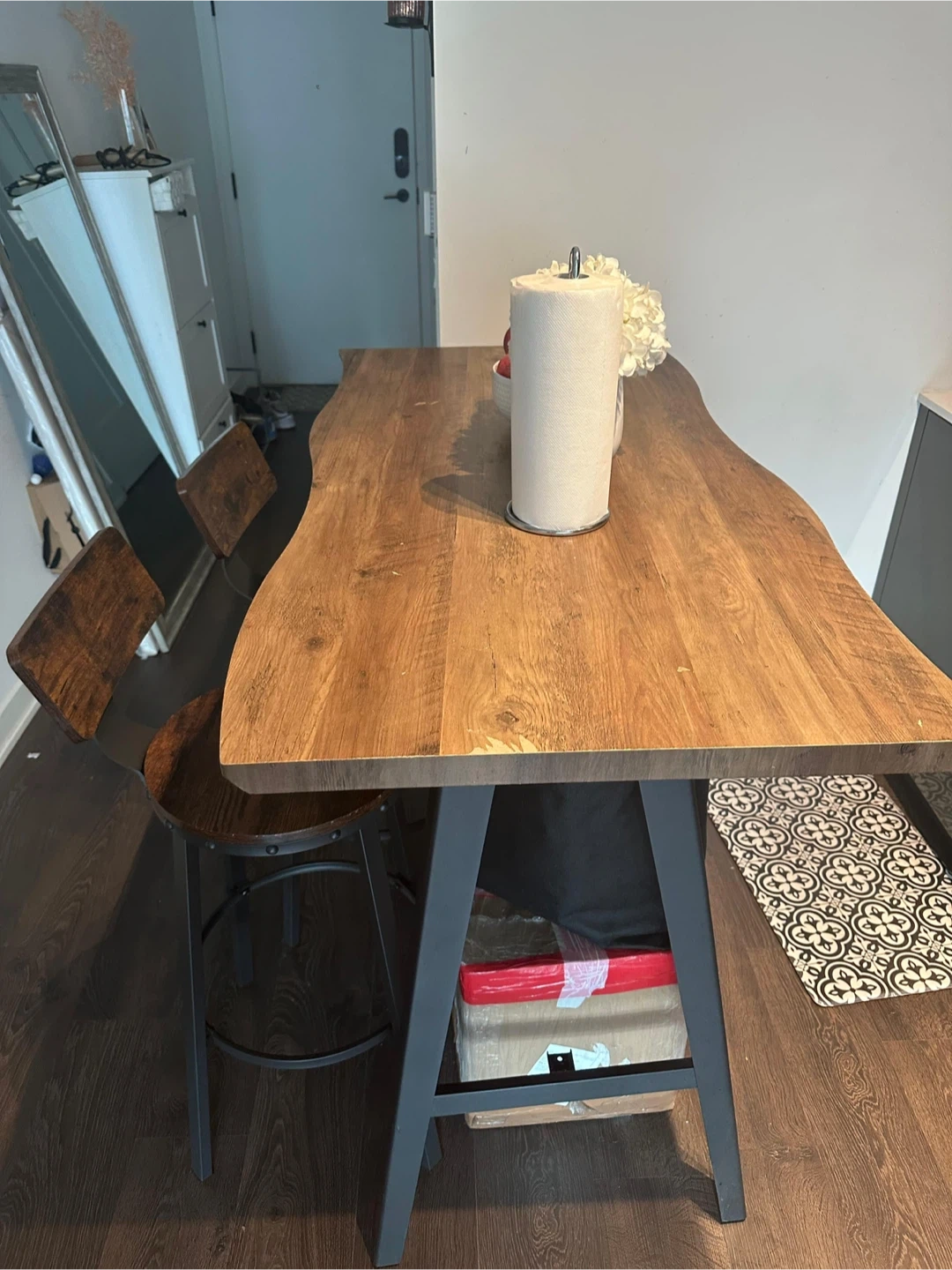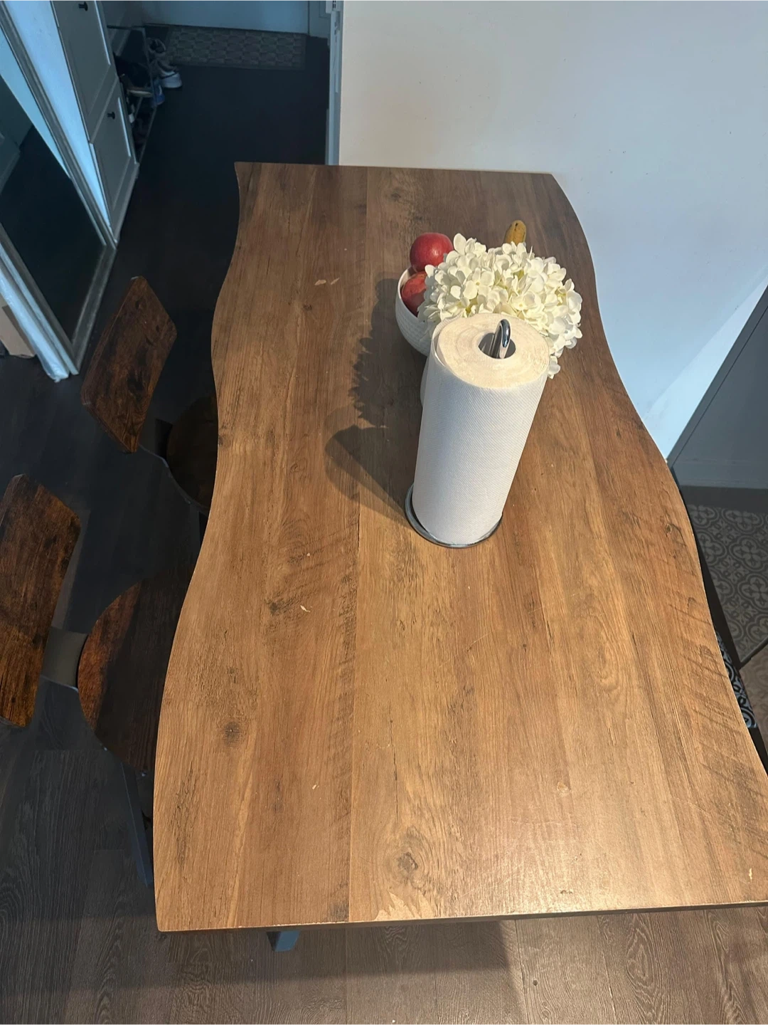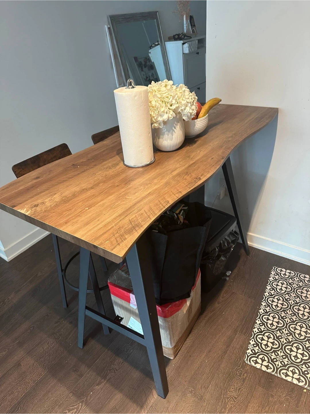 10Selling a beautiful live edge wood dining table! The table has a unique, natural edge that adds a rustic touch to any dining space. Great for a smaller dining area or kitchen nook!