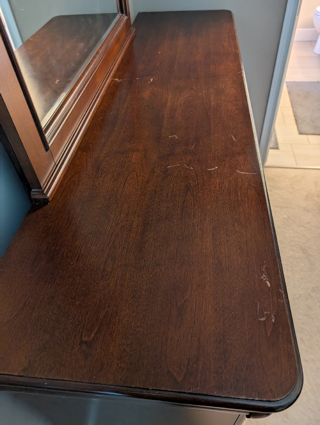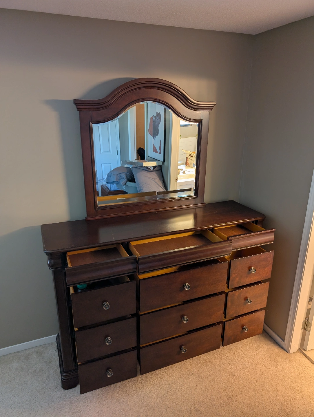 70Selling a wood dresser with a mirror. It features nine full sized drawers and three smaller "hidden" drawers, providing lots of storage space. There are some signs of use, like scratches on the top, but overall it's in good condition and ready for a new home! $250 OBO