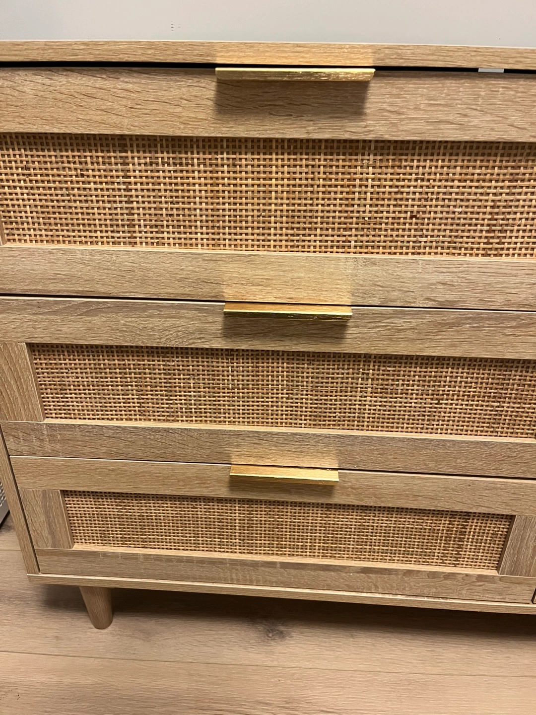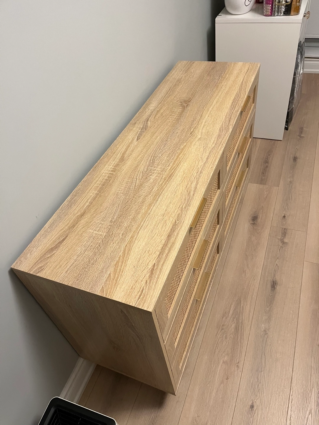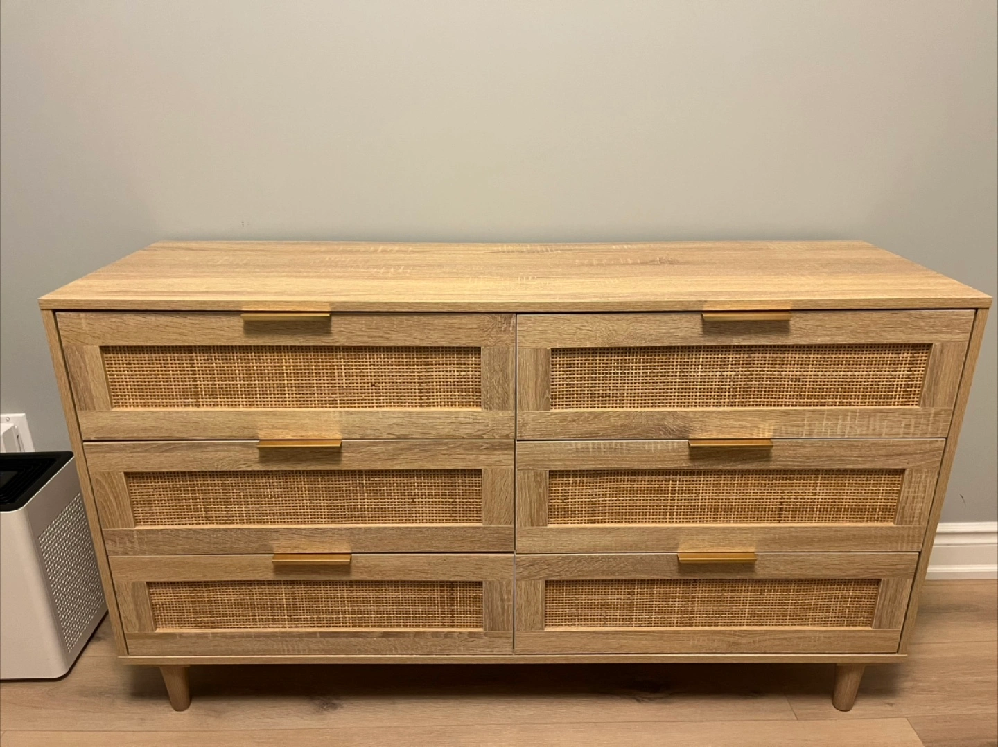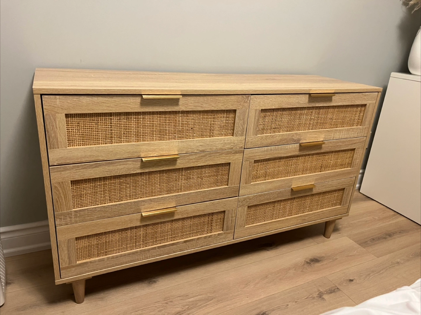 Selling a lovely wood dresser featuring stylish rattan details. It's in great shape and would look fantastic in any bedroom or living space. The dresser has six drawers, providing ample storage. A beautiful piece to add to your home! New assembled and it was too small for my space
