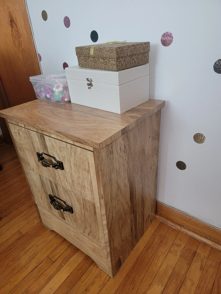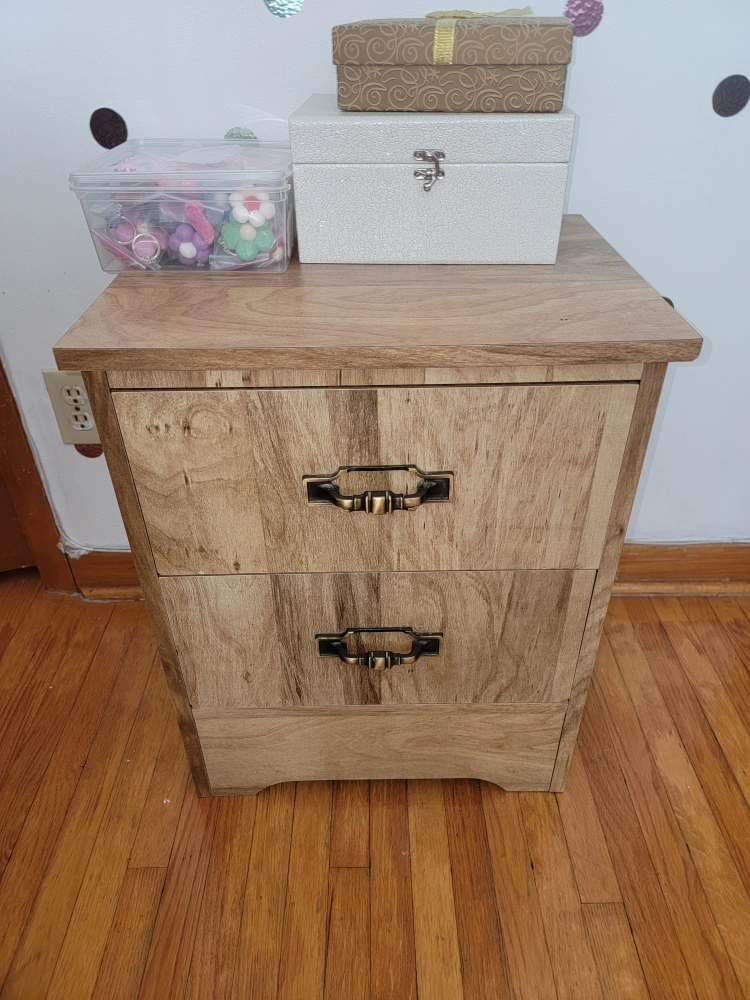 Here's a charming nightstand with a wood finish! It features three drawers, perfect for keeping your bedside essentials organized. The neutral wood tone will complement a variety of decor styles. It's in great shape and ready for a new home