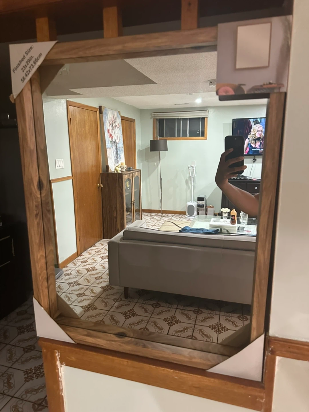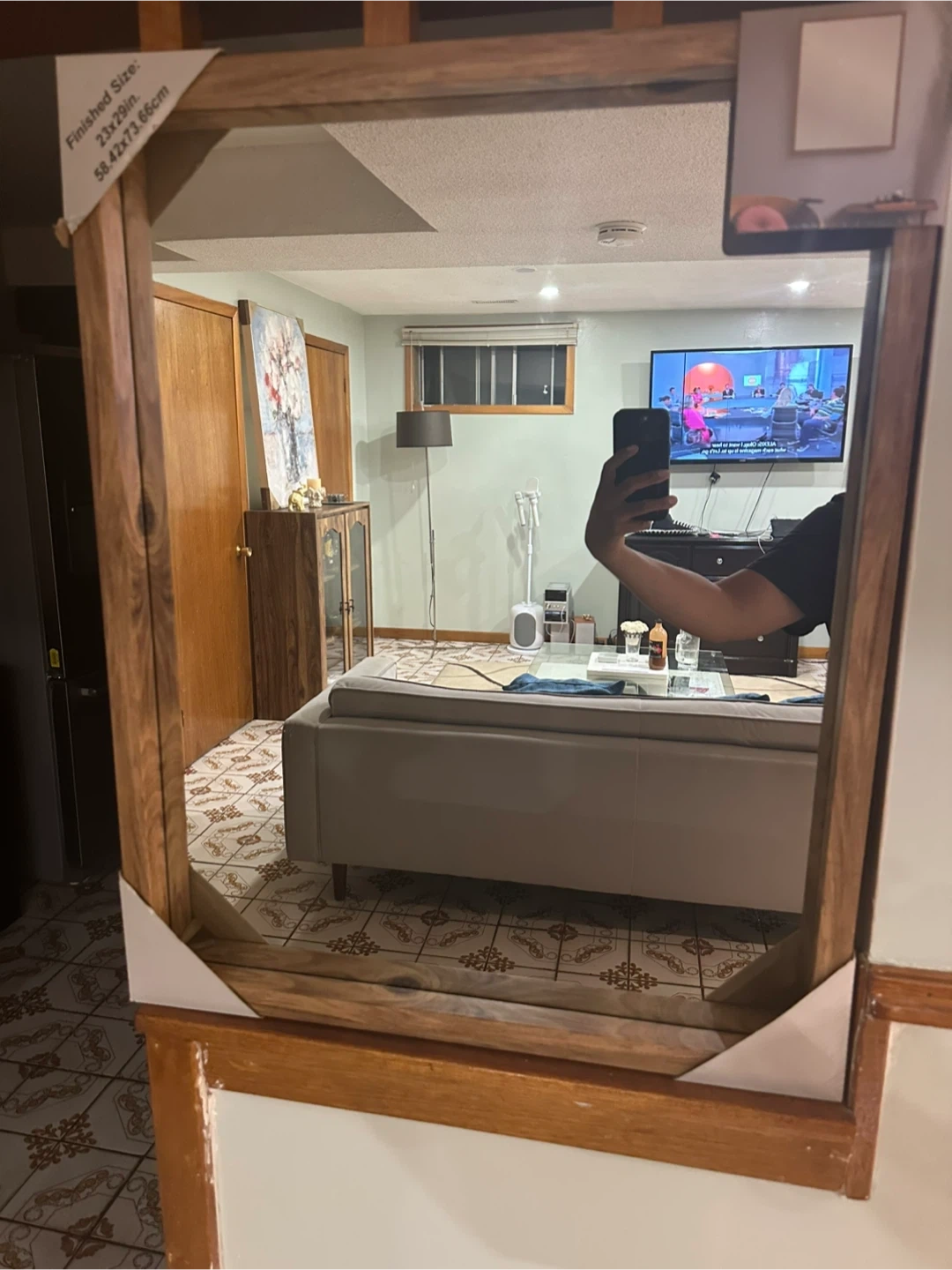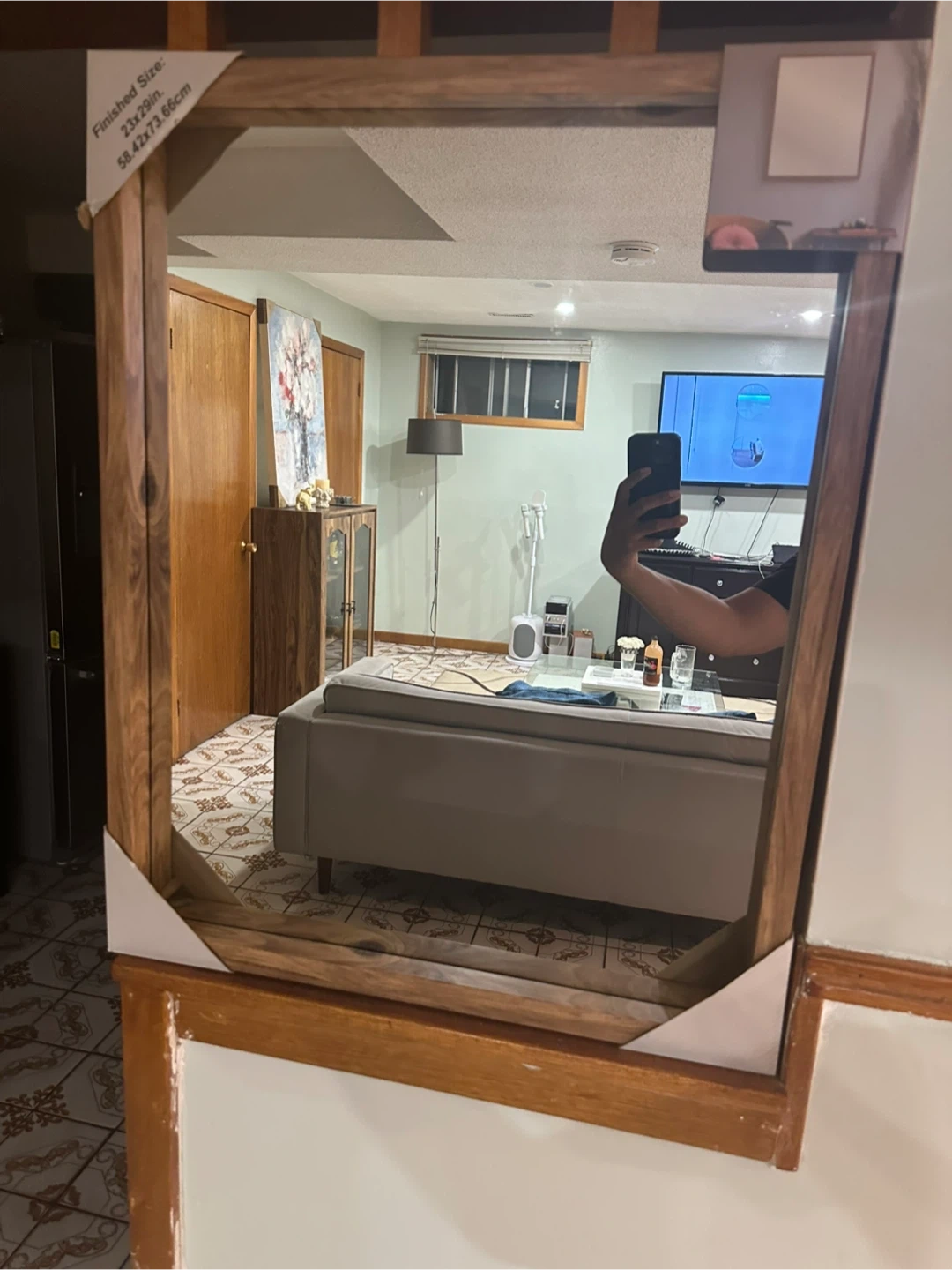 Selling a lovely wood-framed mirror! Its finished size is 23x29 inches (58.42x73.66cm). It's in great condition and ready to brighten up your space