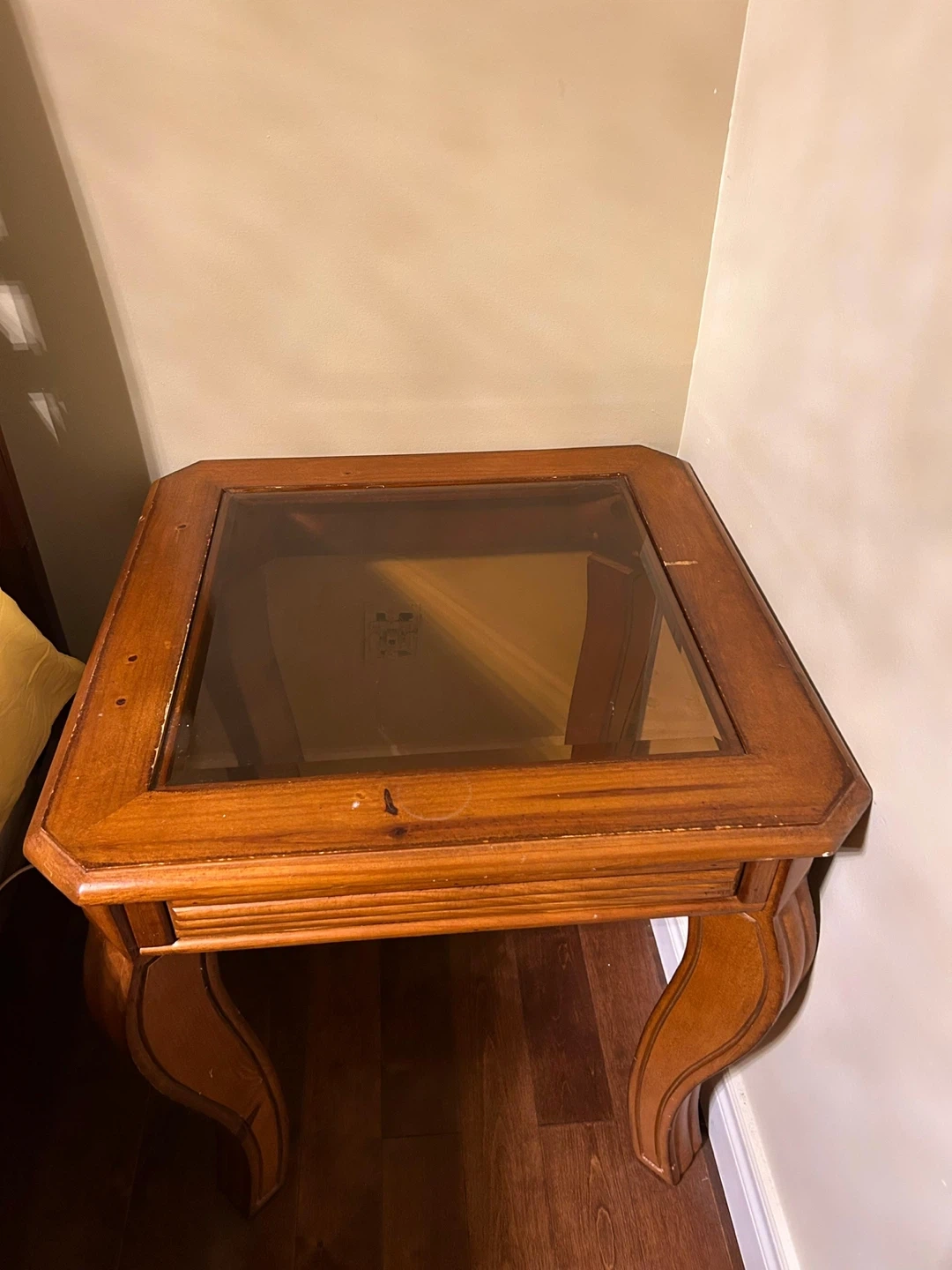 55This is a lovely accent table with a wood frame and a glass top, can be used as night stands as well. This has some minor signs of wear, but is still in good condition. AVAILABLE TILL OCTOBER 30th ONLY.