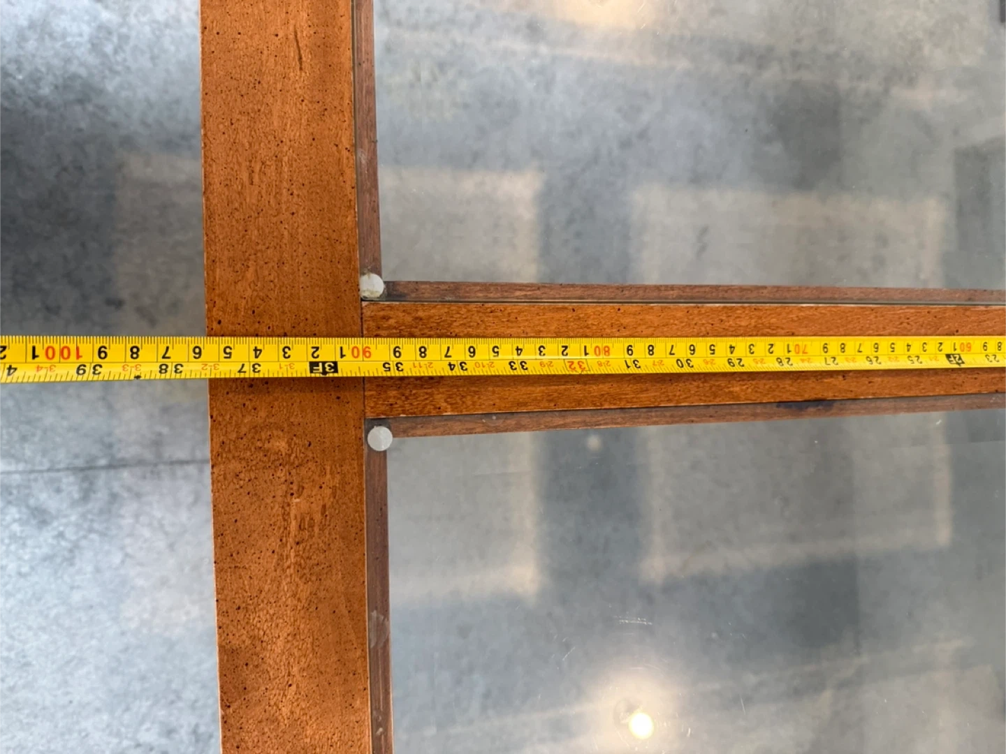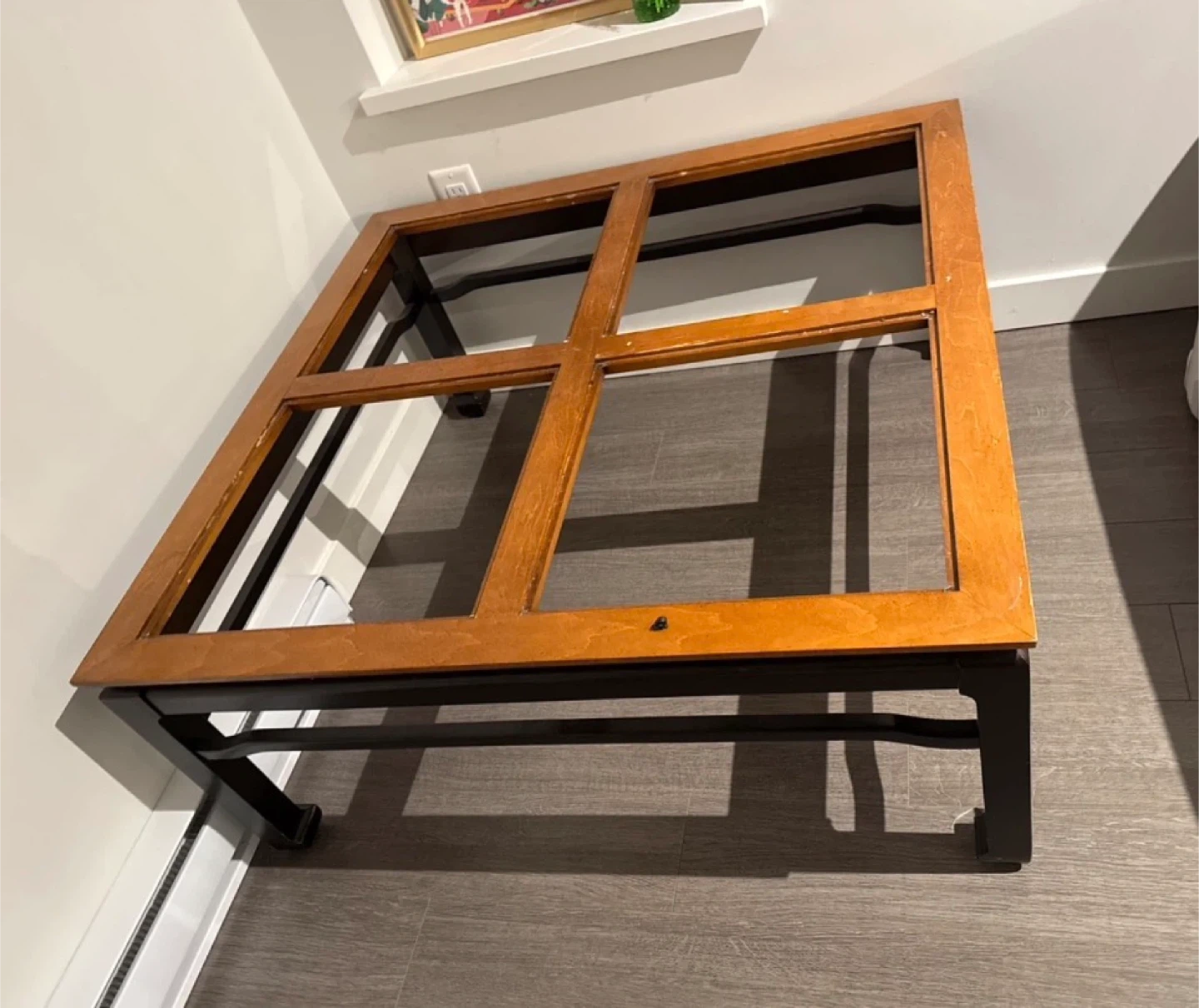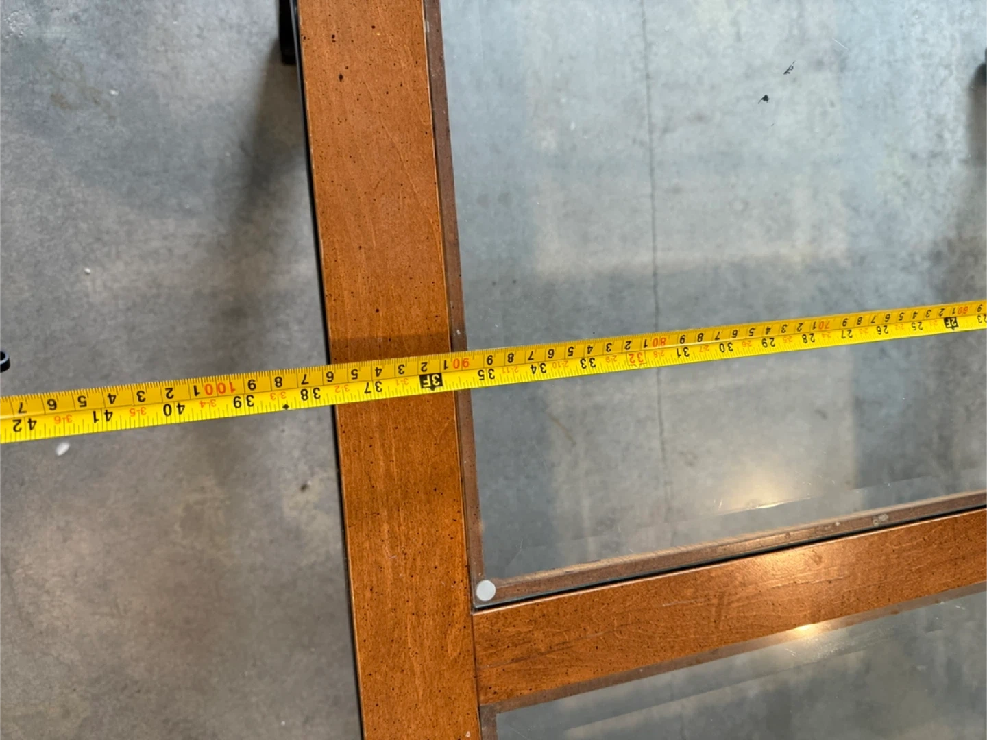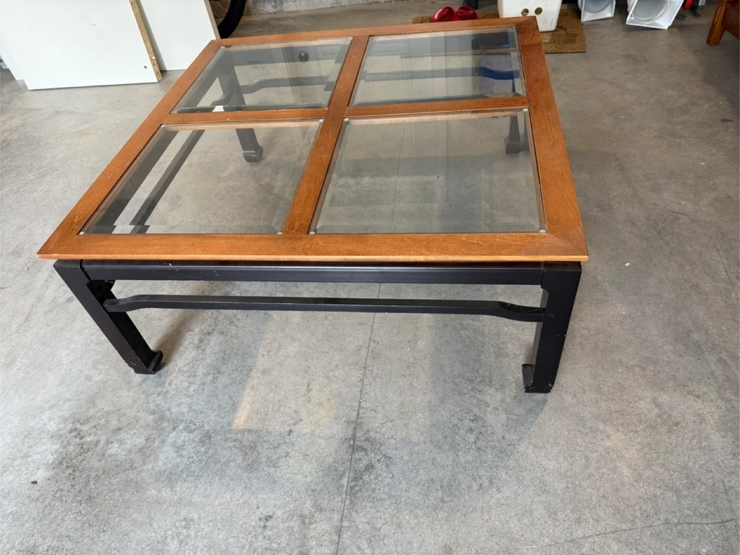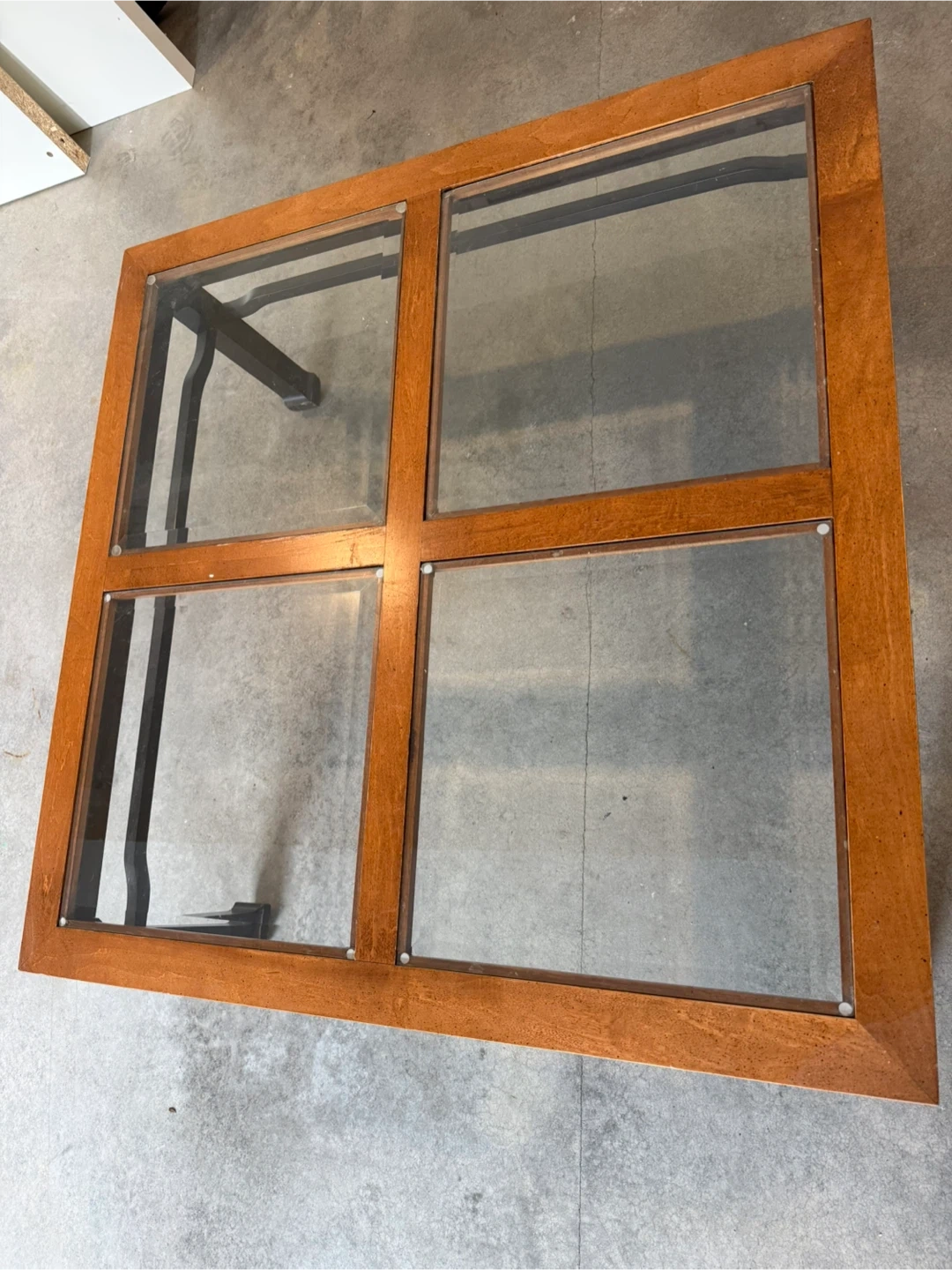 Selling a coffee table with a wood frame and glass top. It measures approximately 39 inches by 39 inches, making it a great size for a living room or den. The frame is a warm wood tone, and the glass is clear. It's in good condition and ready for a new home!
