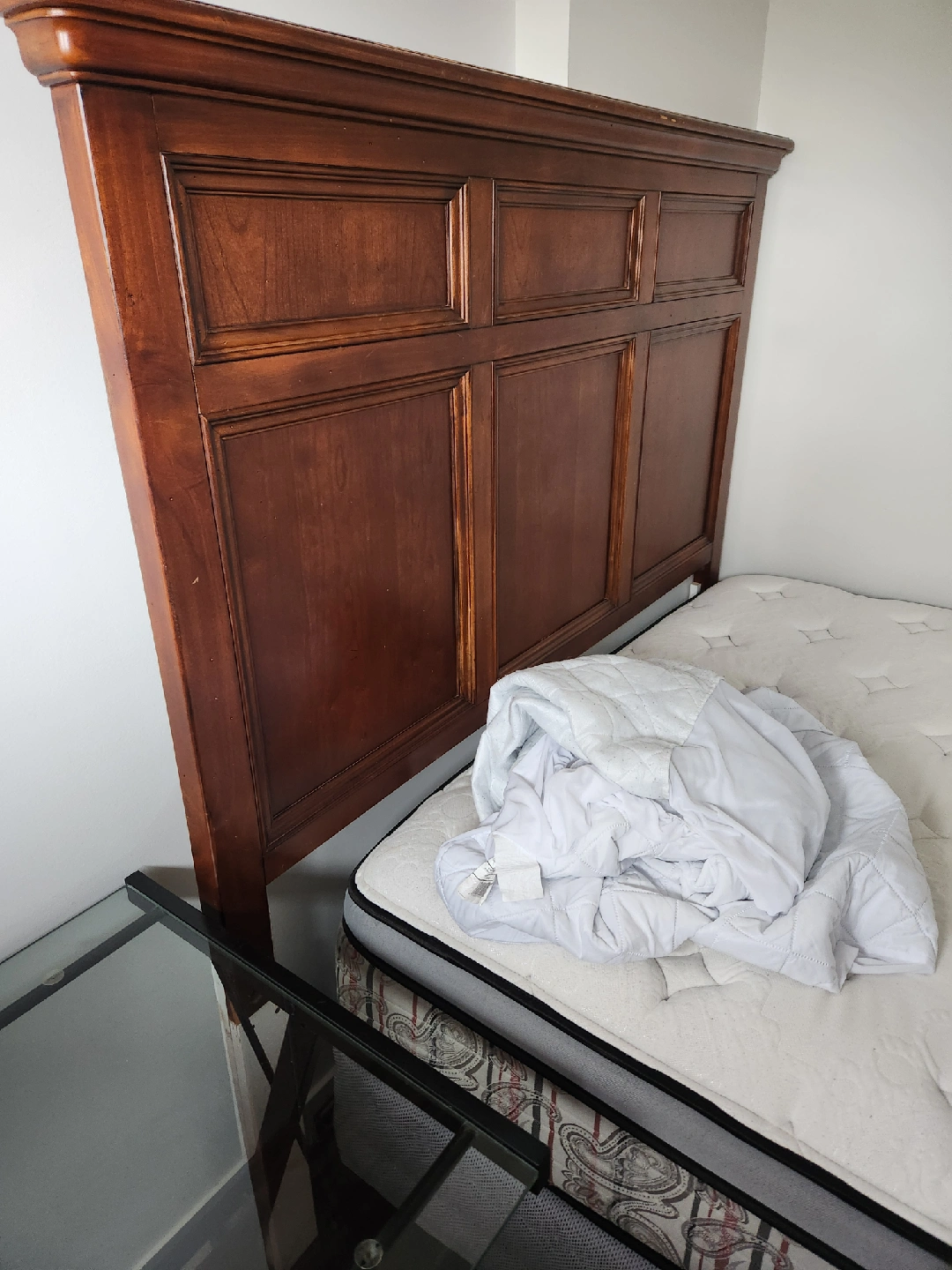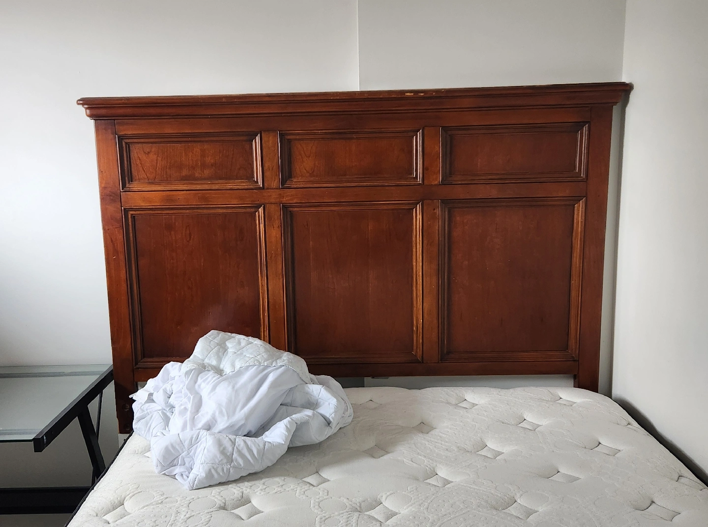 Selling a queen size wood headboard. It's in good condition and ready to add a touch of warmth to your bedroom. Perfect for giving your bed a classic look! Doesn't have to be installed so high