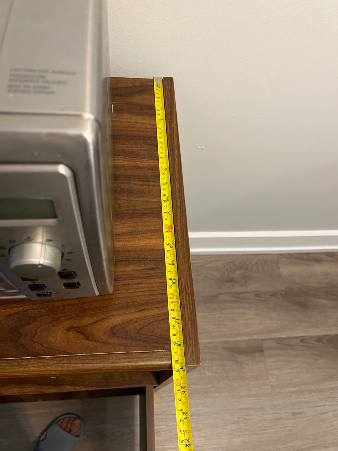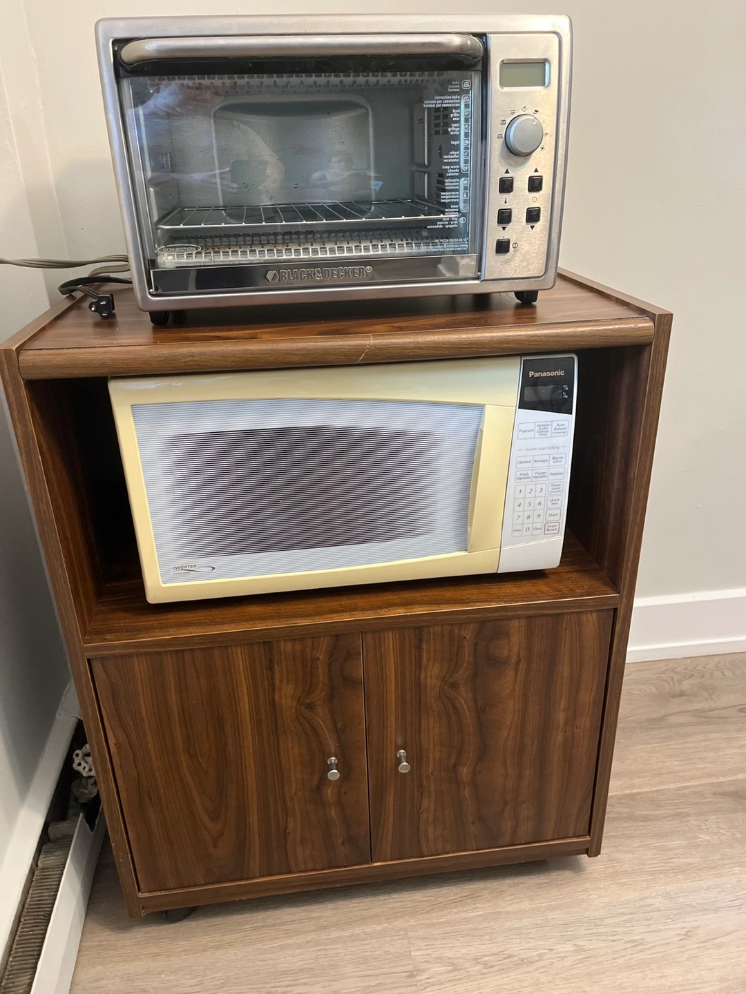 Selling a wood kitchen cart with a cabinet. It's perfect for storing your microwave and toaster oven. The cart measures approximately 21 inches in width and 35 inches in height.