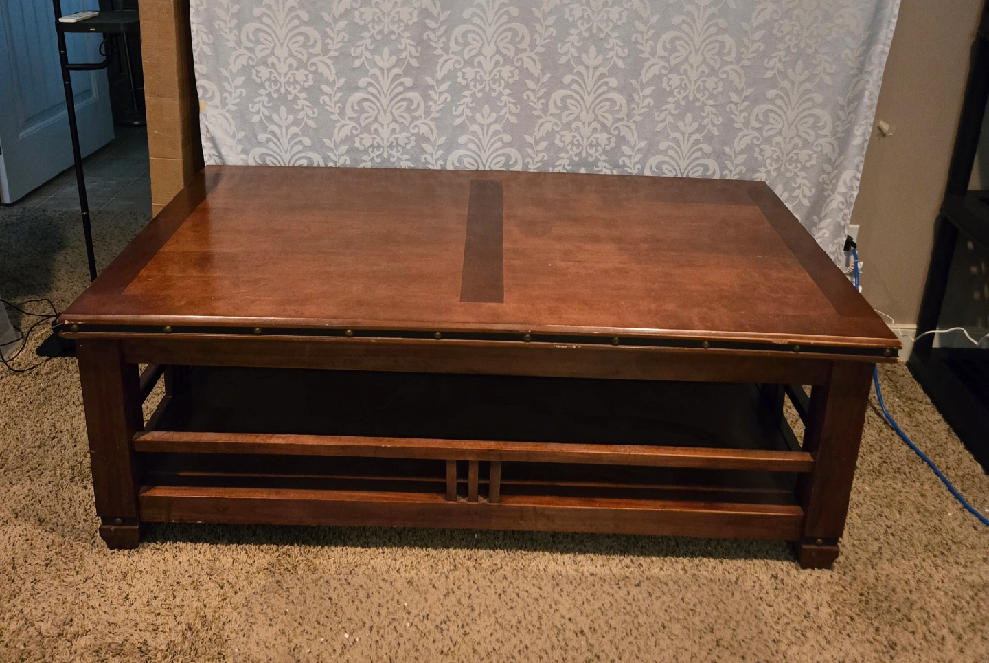 Okay condition. 54" wide, 30" depth and 19" tall. Heavy duty wood top lift coffee table with storage under the lift part. Bottom shelf for storage or decoration. Signs of wear as is from the 90's. Can use as is or restore. Well built and will last a lifetime. Will need 2 very strong people or maybe 3 to move. 2 matching end tables under seperate posts. Cross-posted. 💥If you have a moment please have a look at my other items for sale.