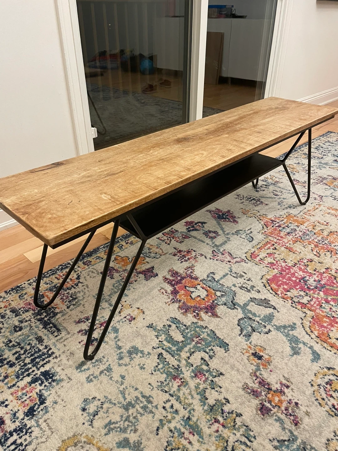 18Selling a stylish coffee table with a wooden top and black metal hairpin legs. It also has a black shelf underneath for extra storage or decor. The table is in great shape and would look great in any living room!